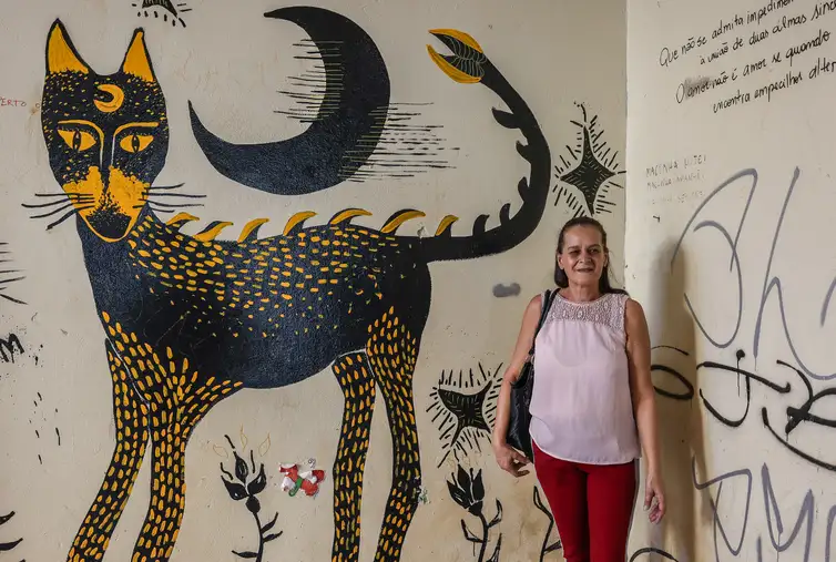 Na mesma caminhada por essa passarela de intervenções urbanas, a auxiliar de limpeza Jane Silva, de 54 anos, diz que faz o mesmo caminho desde 2019. Ficou pensativa diante do grafite de um animal do cerrado. “Eu já tentei decifrar. Ainda não consegui entender que bicho é esse. Mas, como é na ponta da escada, conforme vou chegando perto do desenho significa que estou perto do meu ponto de ônibus”. Ela mora na região administrativa de Samambaia, a uma hora do trabalho.