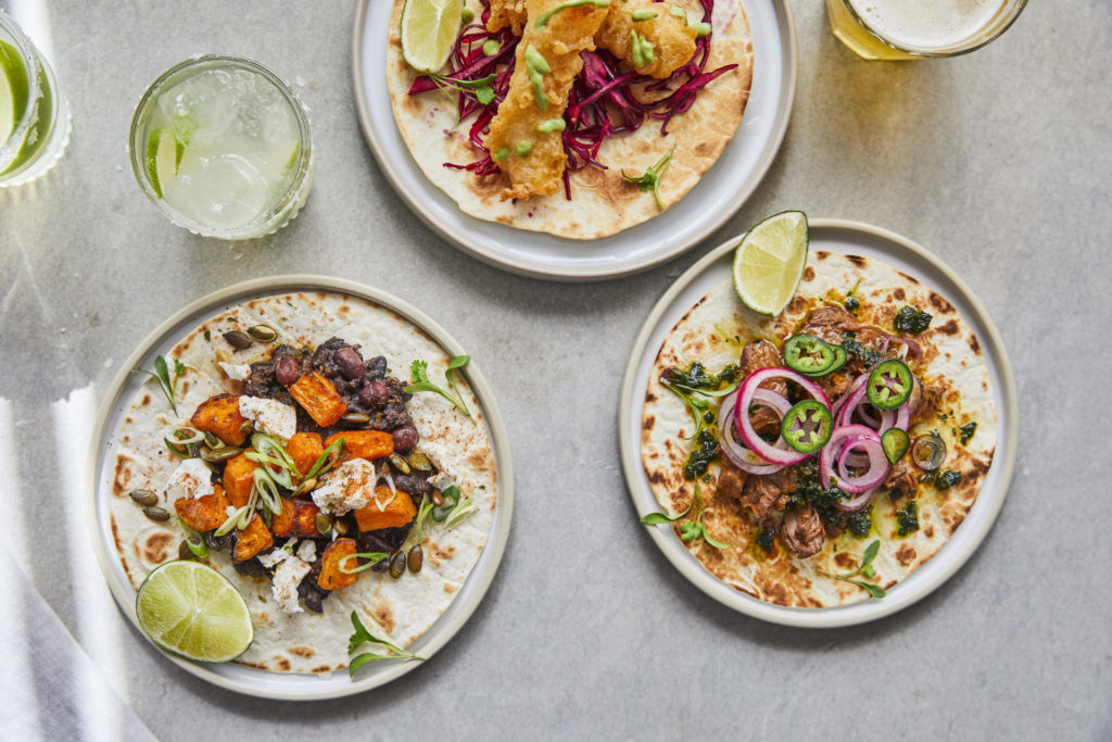 Taco de peixe crocante, Taco de Feijão e Taco de Frango com cachaça