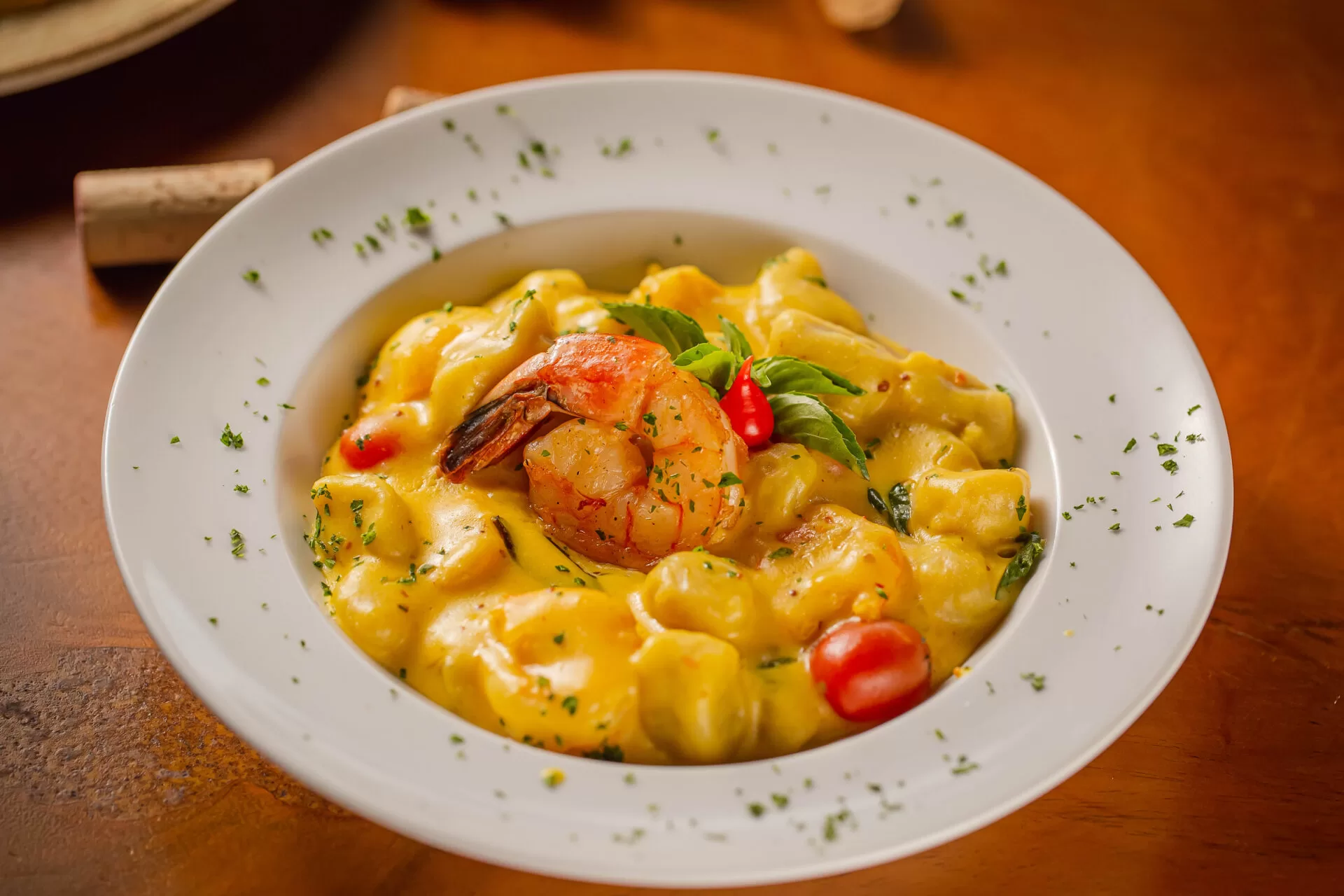 Nos pratos principais, três alternativas se destacam: o Maison Rouge, filé mignon ao molho de três mostardas com nhoque de beterraba; o Gnocchi di Mare, que combina camarões, nhoque de mandioca e molho de mostardas; e o Yuca, opção sem lactose, com nhoque de mandioca ao pesto, cogumelos e legumes, finalizado com crispy de alho-poró.
