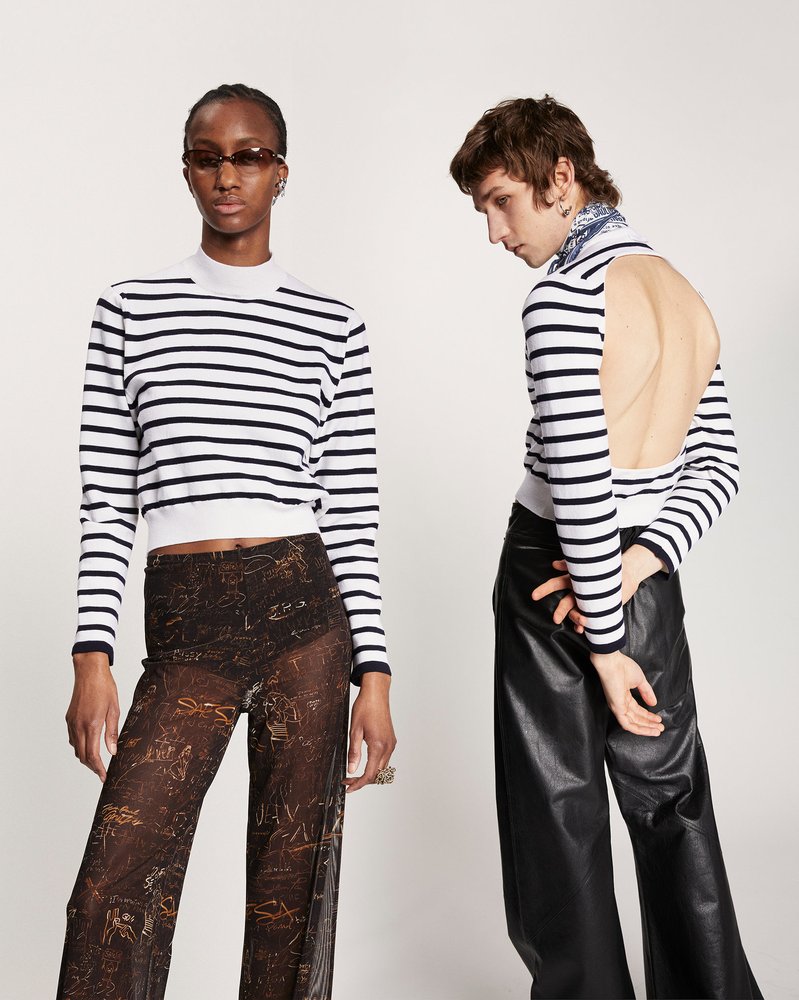 A camisa listrada surge, portanto, disponível em seis versões, sendo uma delas oversized. Nix Lecourt Mansion desenhou um body em malha preta adornado com cristais, cujas riscas abraçam os contornos do corpo, enquanto a Palomo Spain concebeu um espartilho floral memorável. A Ottolinger criou macacões com riscas distorcidas, Alan Crocetti uma joia cônica em forma de sutiã e Marvin M’Toumo acessórios de “conchas e crustáceos”.