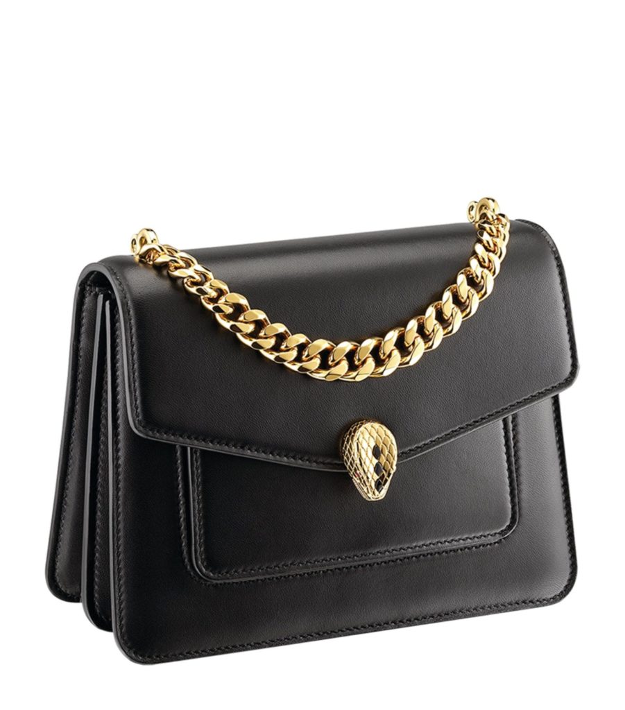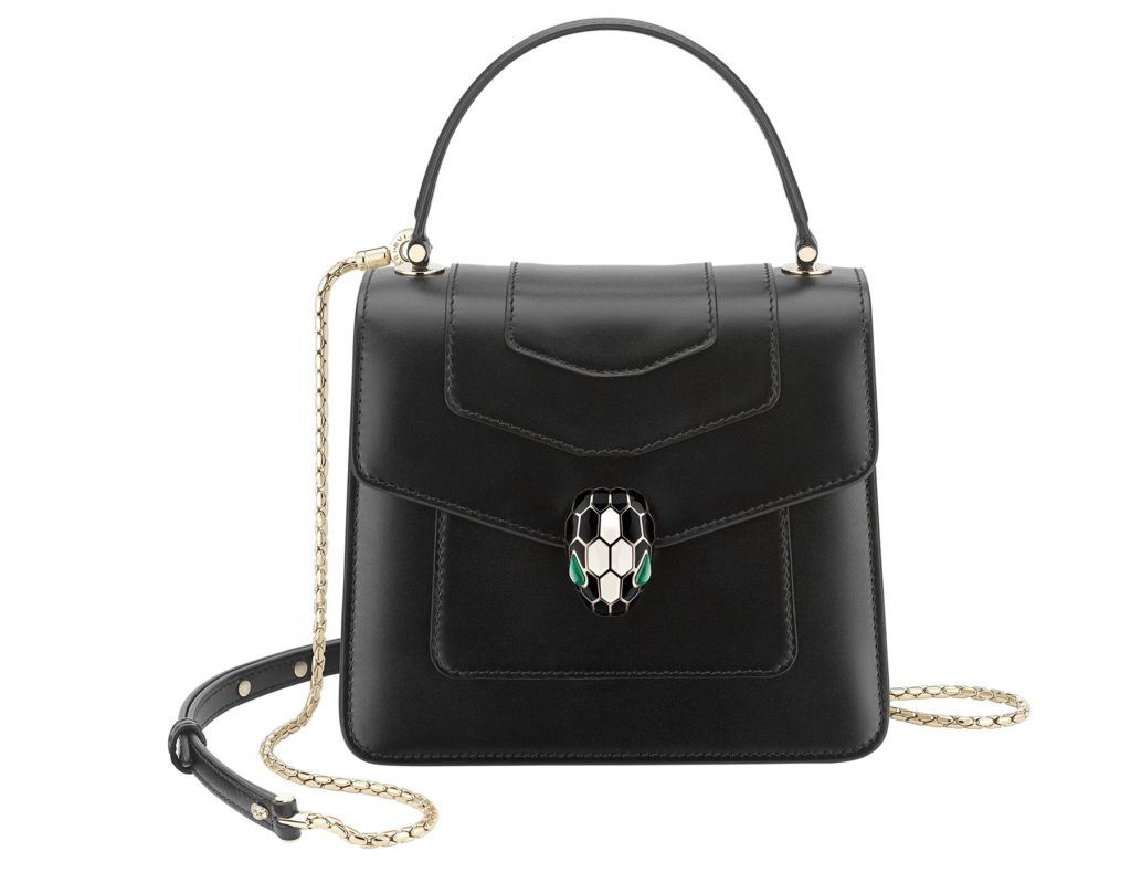 Bolsa a tiracolo “Serpenti Forever” pequena, com corrente em couro napa preto, com forro interior também em couro napa preto. Fecho Heritage Serpenti em latão banhado a ouro, finalizado com pequenas escamas de ônix preto no meio e olhos esmaltados vermelhos.