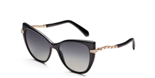 Óculos de sol Serpenti com armação preta e lentes cinza com hastes de metal com detalhes de escamas em ouro rosé.