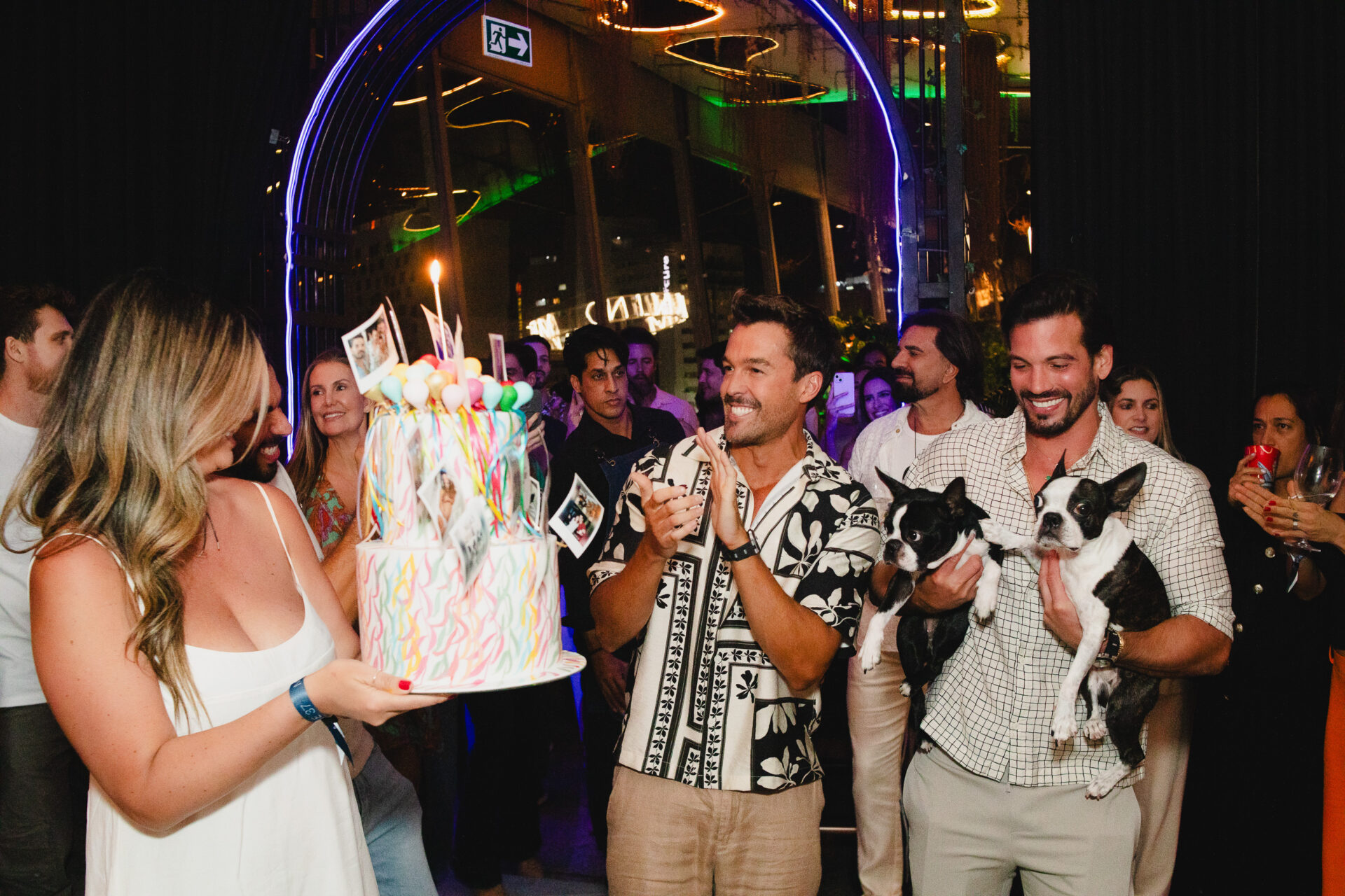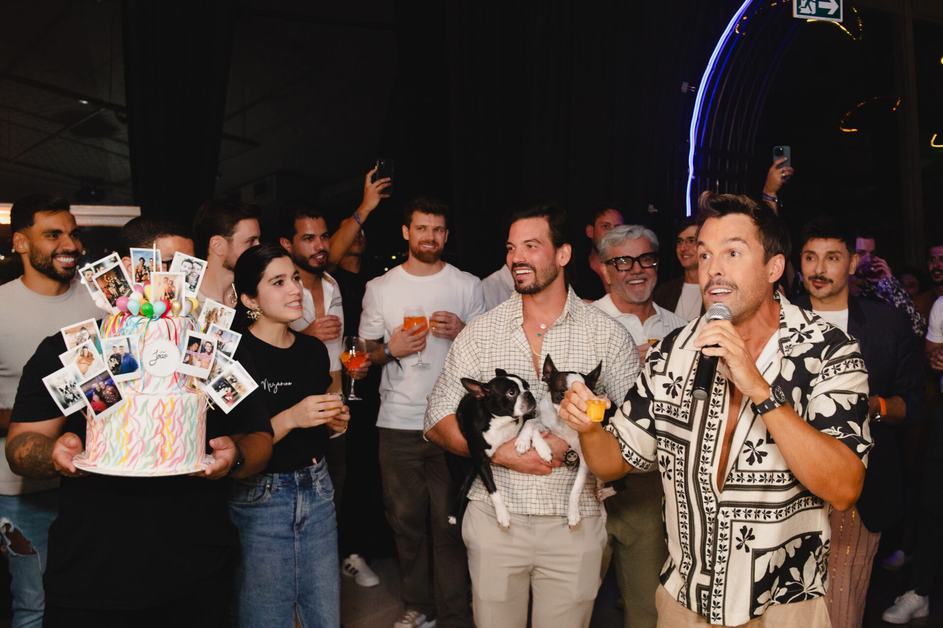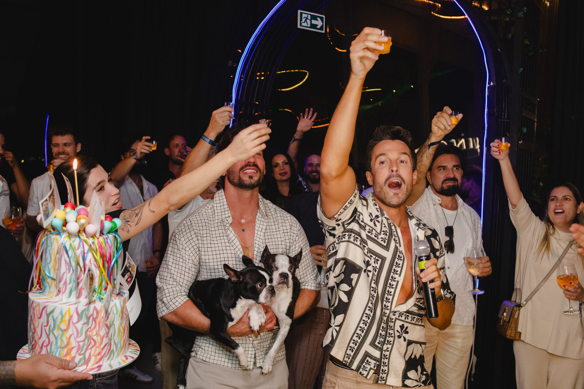 Um dos momentos mais marcantes da noite aconteceu na hora dos parabéns, quando os dois pets do aniversariante fizeram uma aparição surpresa, levados até o local pelo namorado, Caio Gazel, arrancando sorrisos e aplausos dos convidados.