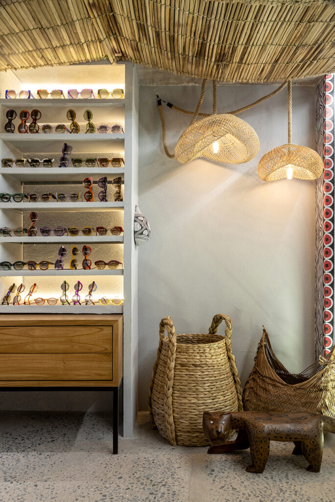 Composto por obras que trazem vida e beleza para a ótica, o espaço conta com uma pintura desenhada por Maite Barbosa feita exclusivamente para o ambiente. O mobiliário é de madeira maciça integrado com estante de concreto com fundo retro iluminado e itens decorativos como: cocar terra, pingentes de barro natural, cesto usado para pesca e peneiras com grafismos indígenas.