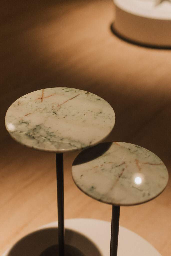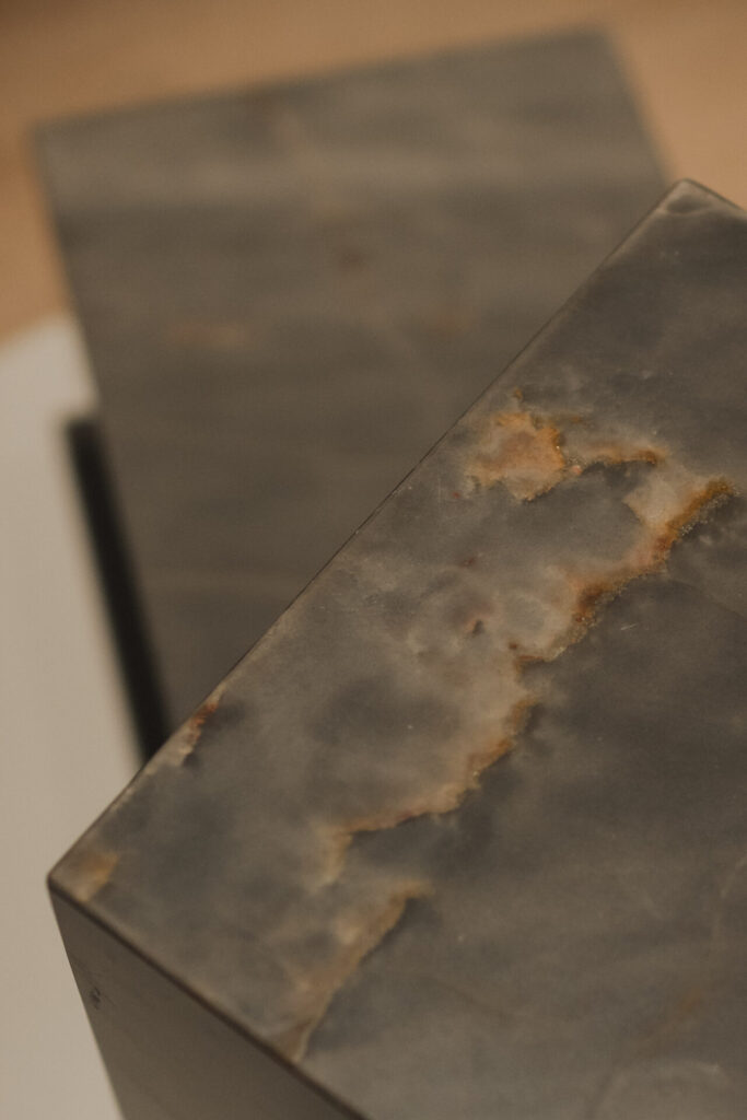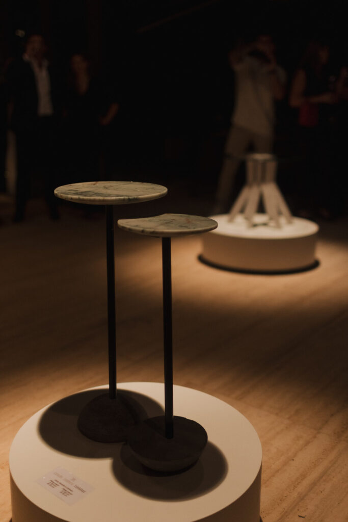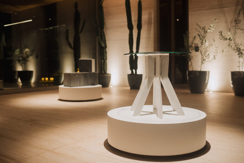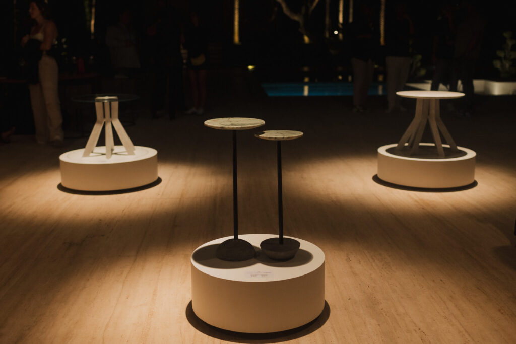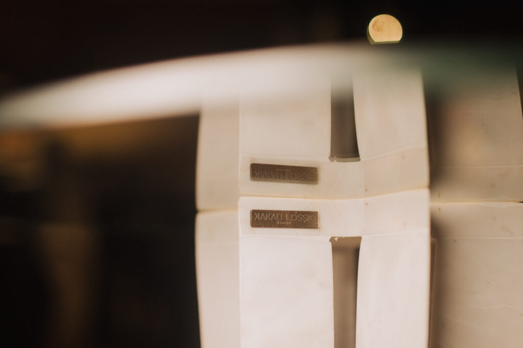 A primeira coleção de mesas autorais de Kakau Lossio utiliza materiais como pedra, vidro, metal, e concreto, que são os principais elementos utilizados na construção de Brasília. Ela explica que o concreto é o material base da cidade, e a pedra um material nobre, que foi estudado individualmente antes de ser colocado em cada móvel, já que Lossio também é amante das pedras, elas fazem parte da vida da designer.
