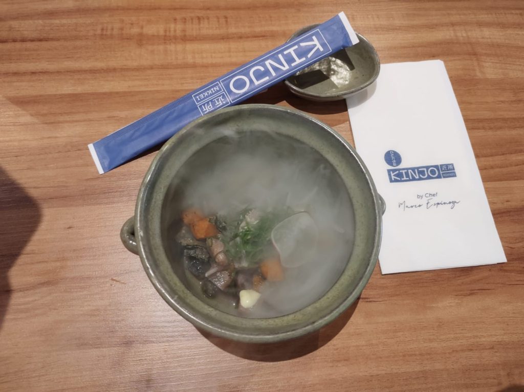 Entre as sugestões de entrada para eleger uma opção, Ceviche Kunsei de Atum (atum na brasa, cebolinha, nori crocante e molho ponzu); Gyosa de salmão cítrico (salmão confitado, legumes e molho cítrico) ou Salada Kinjo (tomate cereja defumado, mix de folhas verdes e molho yuzu).