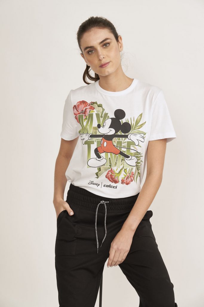 A cartela de cores é neutra, com branco, cinza, preto e azul marinho, com toques de vermelho, rosa e lilás. Já nos tecidos o moletom reina, mas camisetas de algodão, caneladas e conjuntinhos de plush também marcam presença. O personagem mais famoso do mundo não ficou de fora e o Mickey Mouse aparece em camisetas descoladas, em estampas florais ou com escritos.