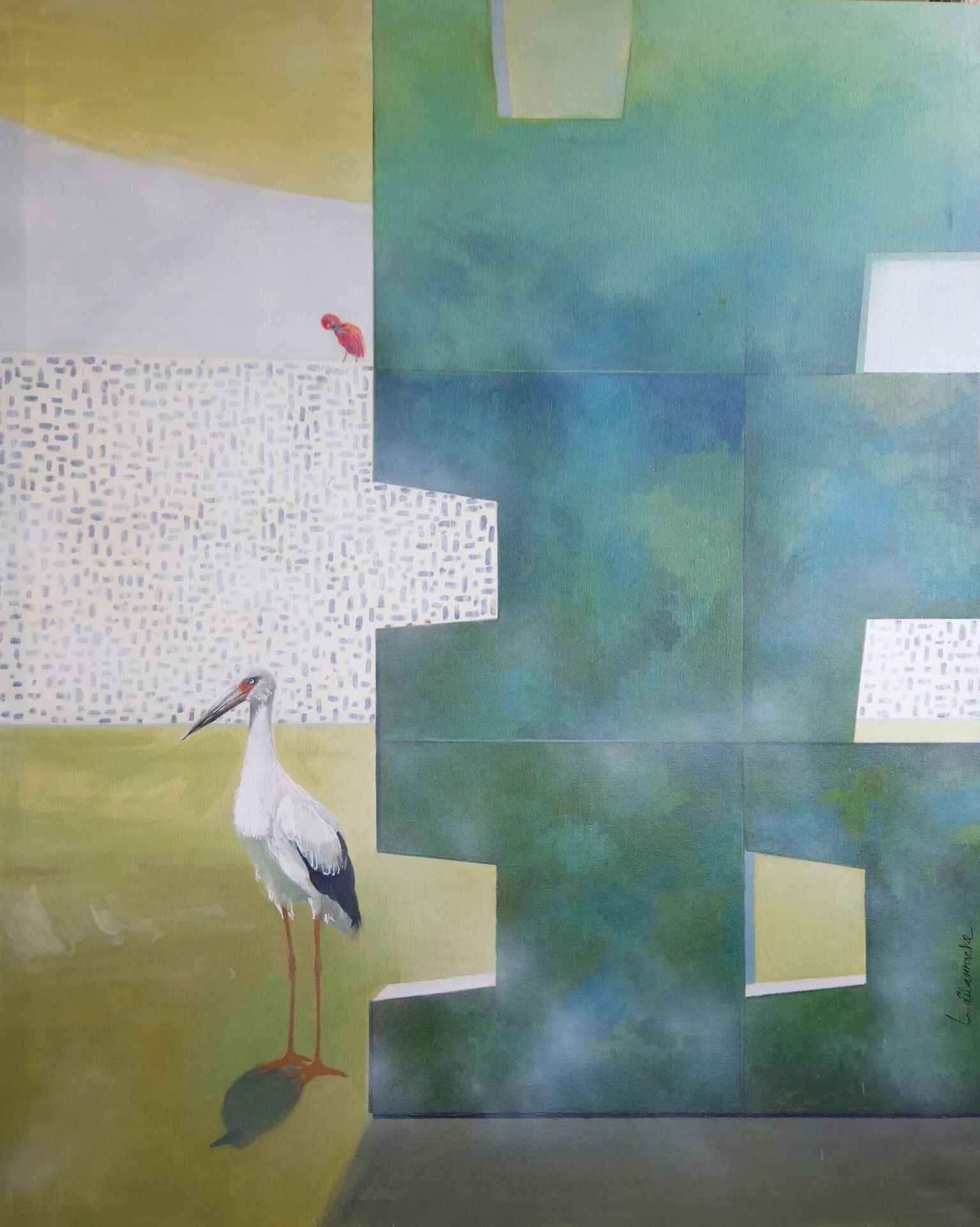 As telas revisitam referências culturais brasileiras — do manto cerimonial dos Tupinambá às paisagens inspiradas por Burle Marx — ao mesmo tempo em que incorporam aves como o íbis-vermelho, a curicaca e o maguary. A artista articula natureza, corpo e espaço construído, fazendo de cada obra um território onde história, espiritualidade e contemporaneidade se encontram.