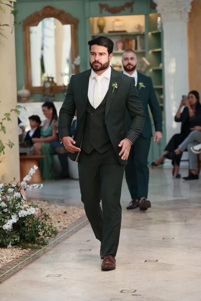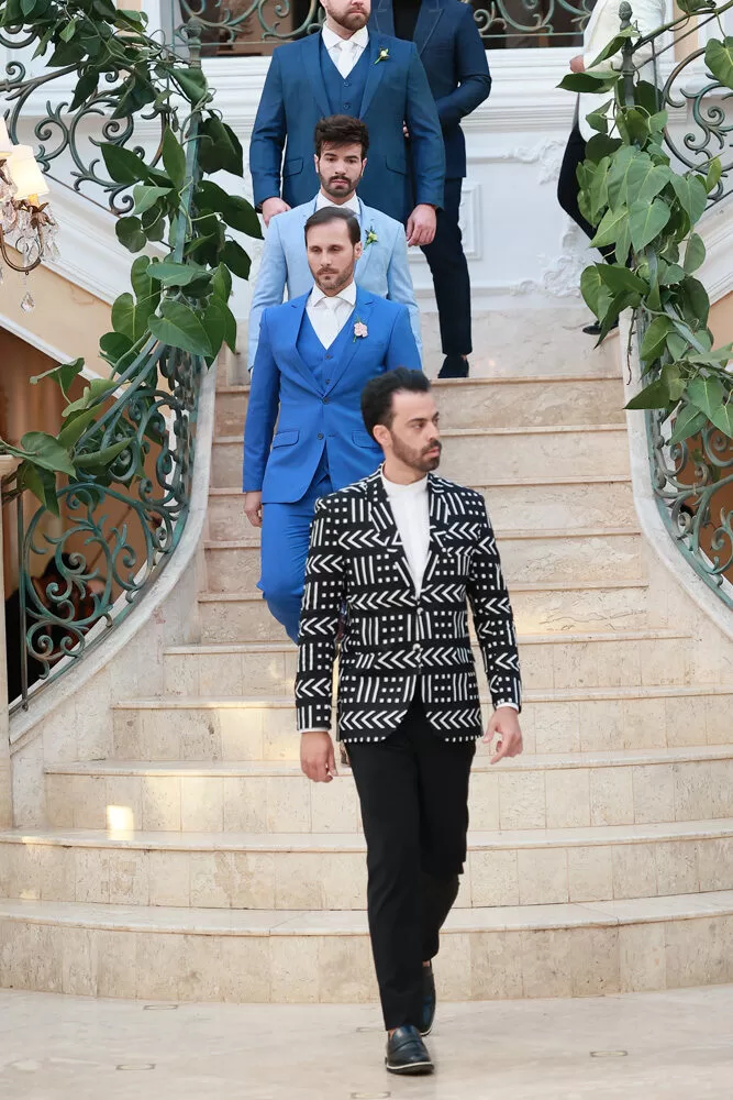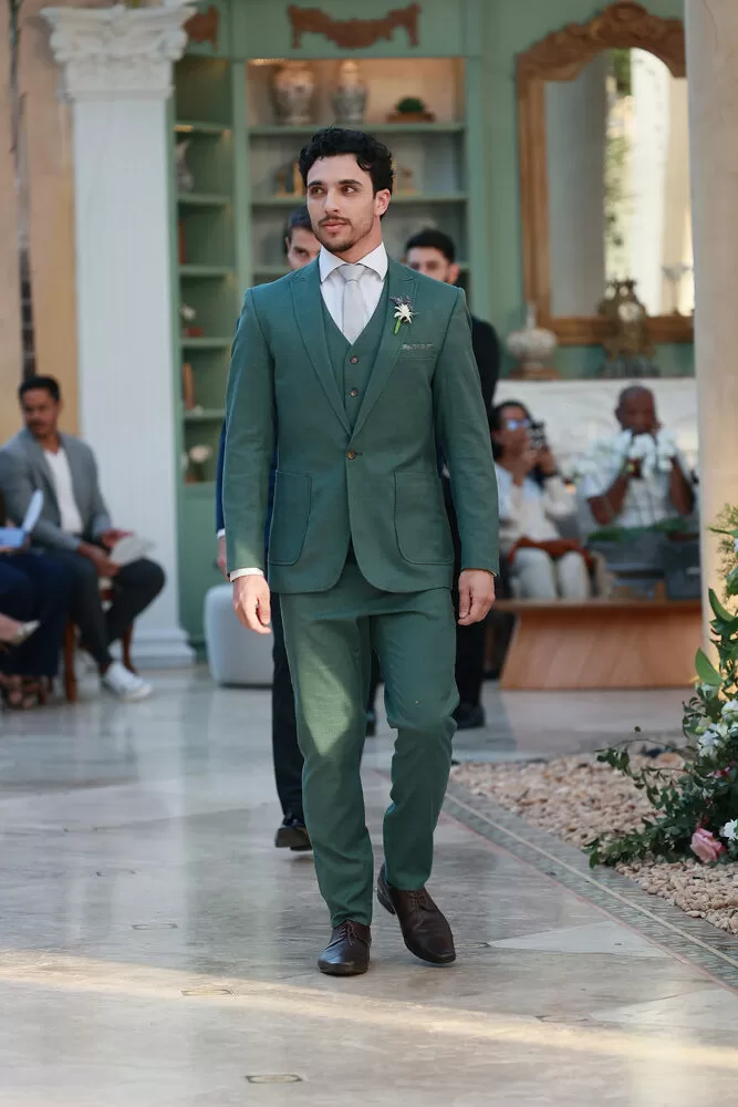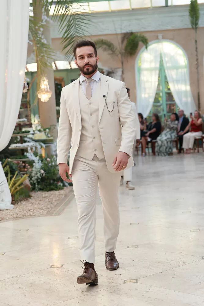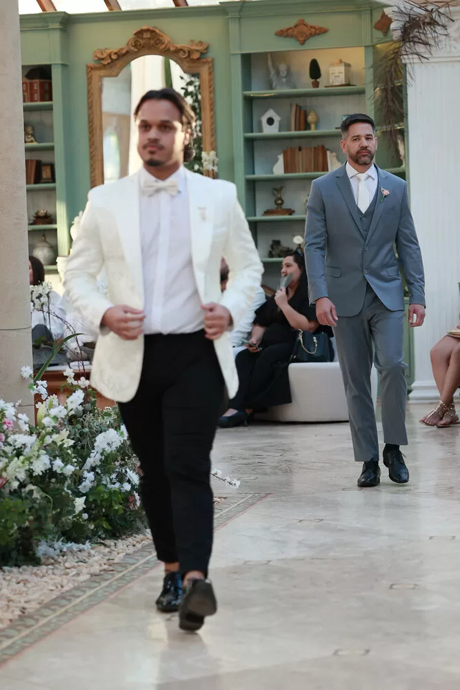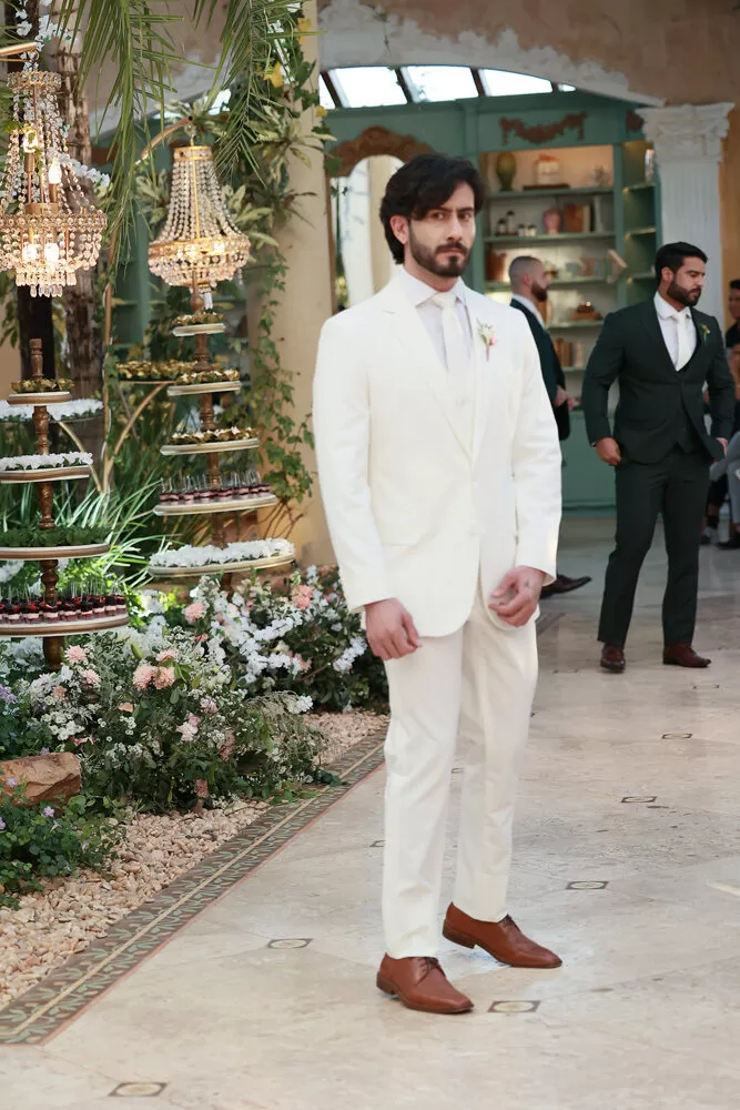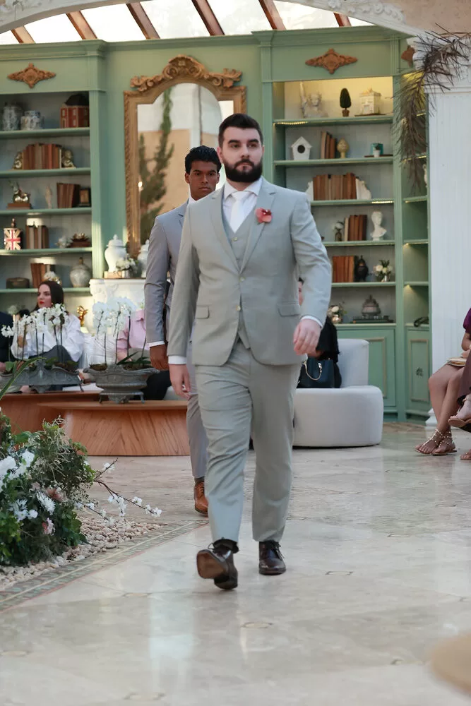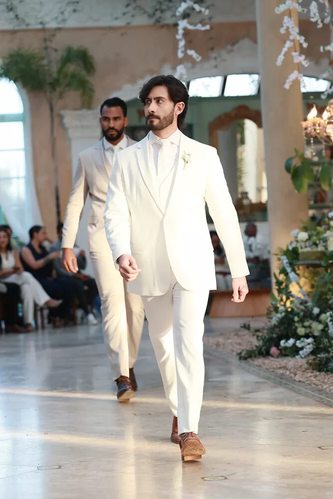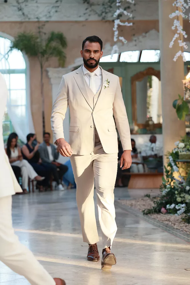 A coleção, que transita entre o clássico e o contemporâneo, é uma verdadeira celebração da alfaiataria como forma de expressão. Tons claros — como off-white, bege e suaves variações de verde — ganharam destaque nas passarelas, ao lado do tradicional azul-marinho, que permanece como símbolo de sofisticação. As peças foram desenhadas para vestir o noivo em todos os momentos: dos mais formais, com smokings estilizados e versões em veludo, aos mais ousados, com tecidos adamascados, jeans trabalhado e bordados exclusivos que imprimem personalidade e autenticidade.