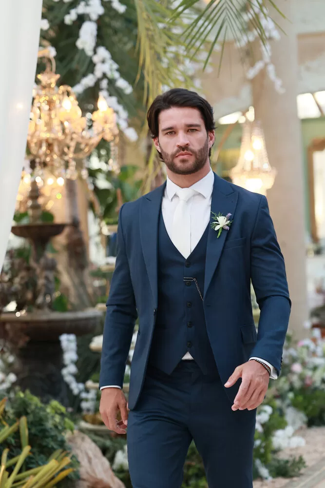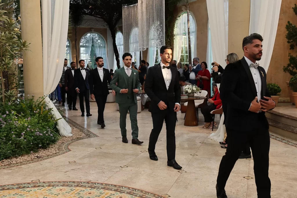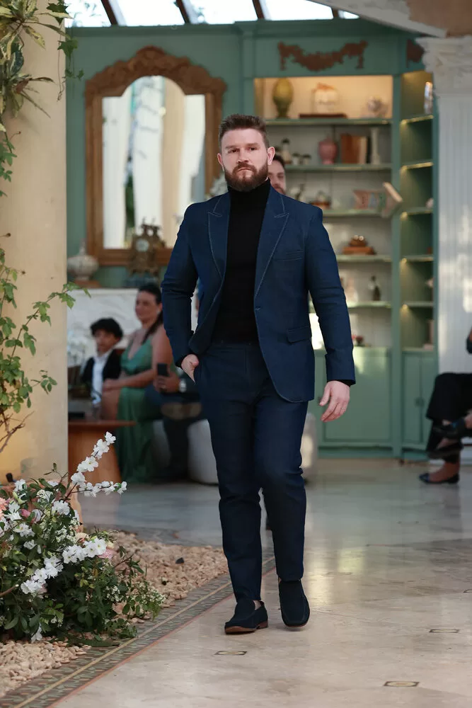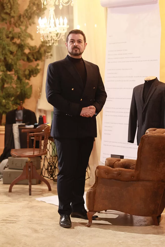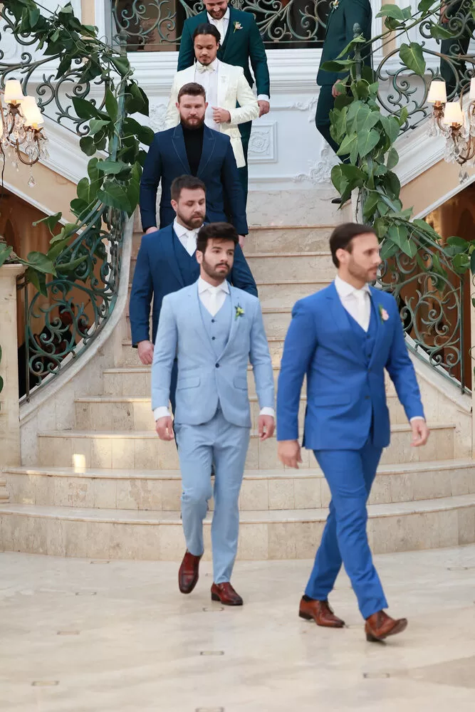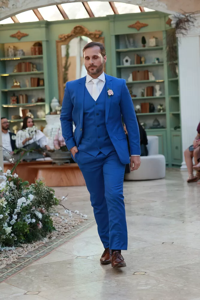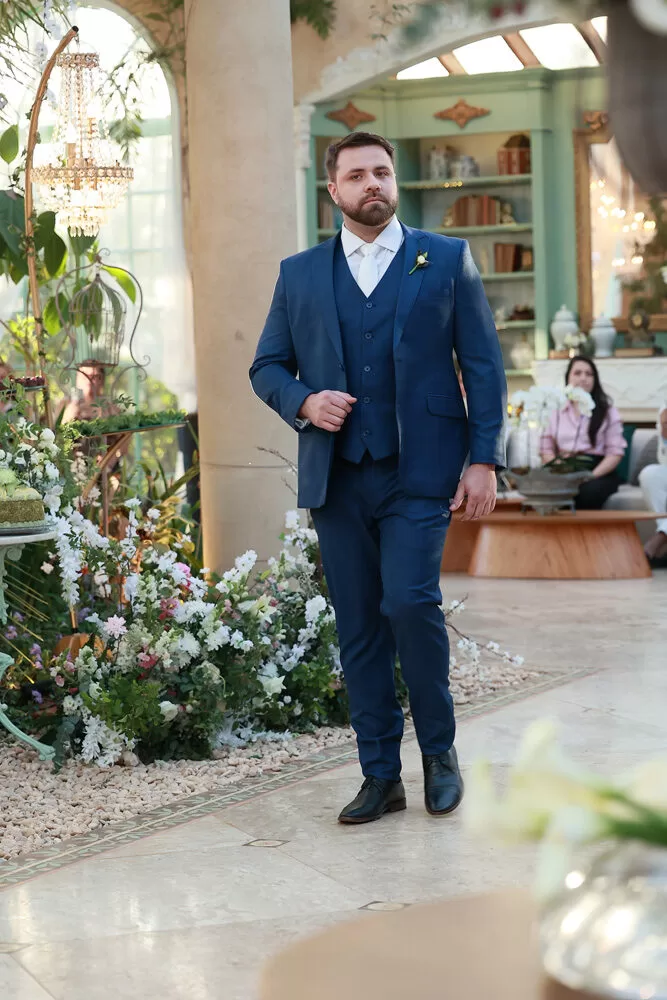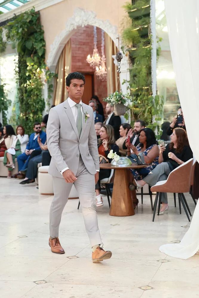 A coleção, que transita entre o clássico e o contemporâneo, é uma verdadeira celebração da alfaiataria como forma de expressão. Tons claros — como off-white, bege e suaves variações de verde — ganharam destaque nas passarelas, ao lado do tradicional azul-marinho, que permanece como símbolo de sofisticação. As peças foram desenhadas para vestir o noivo em todos os momentos: dos mais formais, com smokings estilizados e versões em veludo, aos mais ousados, com tecidos adamascados, jeans trabalhado e bordados exclusivos que imprimem personalidade e autenticidade.