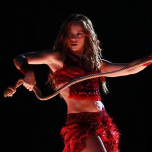 Recebida por muitos fogos de artifício, Shakira abriu a apresentação cantando alguns de seus sucessos, como “She Wolf,” “Whenever, Wherever” e “Hips Don’t Lie”. A cantora colombiana tocou guitarra, embalou alguns segundos de “Kashmir”, do Led Zeppelin, e não perdeu a chance de fazer sua famosa dança do ventre (com uma corda imitando os movimentos de uma cobra). Depois, se jogou na plateia. O cantor porto-riquenho Bad Bunny fez uma participação.