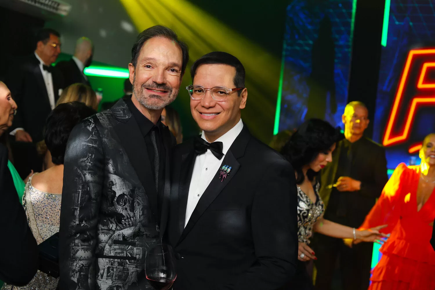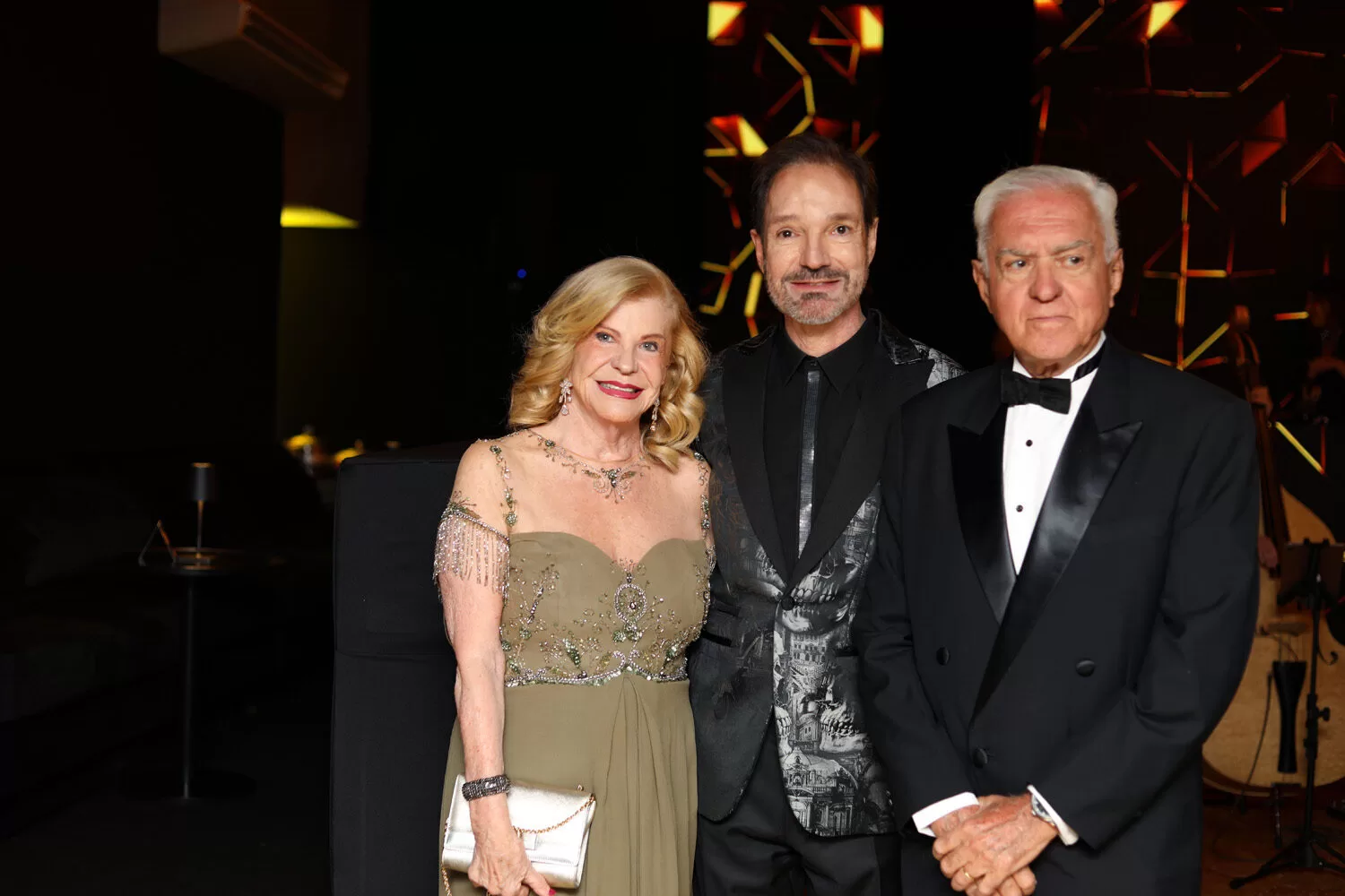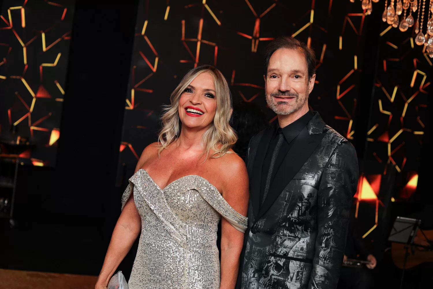 O anfitrião, Amador Outerelo, surgiu impecável em um smoking Philipp Plein, personificando o glamour contemporâneo com referência vintage. O menu da noite, assinado por Renata La Porta, foi um espetáculo à parte — uma viagem gastronômica aos anos 80 com iguarias como caviar servido em ovos de codorna, bisque de lagosta, charutinho de queijo parmesão, steak tartar à la minute e cascata de camarão ao molho Waldorf. Miniaturas requintadas, como canapés gratinados de cebola, maionese de bacalhau com crisps de alho-poró e espetinhos de Parma com melão orange, completavam o deleite visual e gustativo.