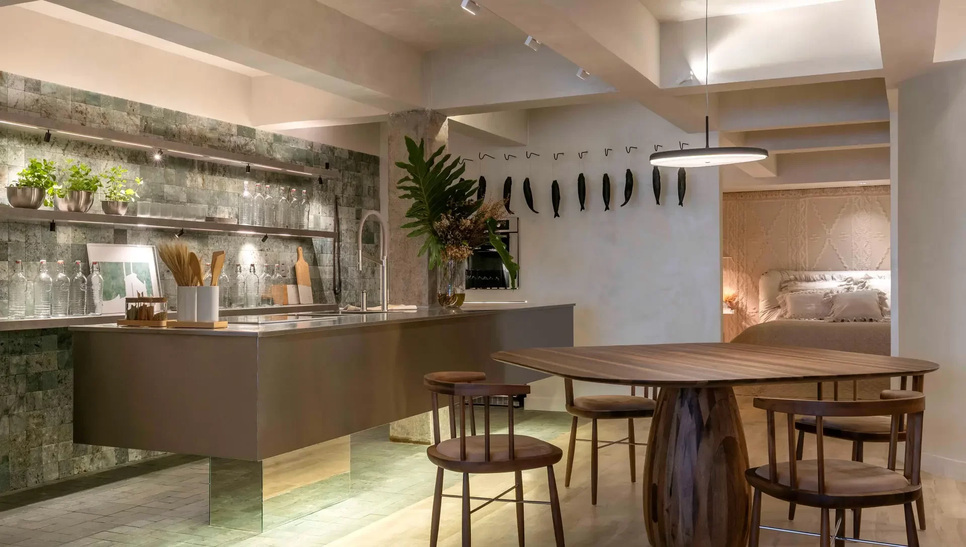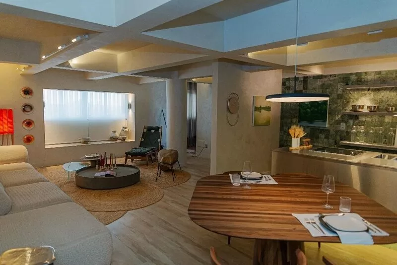 O ambiente assinado pela arquiteta Juliana Santana representa um pequeno apartamento pensado para um morador jovem, prático e atento ao design brasileiro. A proposta cheia de texturas mistura modernismo com referências industriais, em um layout que remete a lofts urbanos. O uso do metalizado na bancada traz um olhar futurista, equilibrado por materiais naturais como a pedra. A curadoria artística se destaca pelo olhar criterioso da arquiteta pelos novos artistas que tem se destacado no mercado da arte. Já a suíte pelos revestimentos exclusivos garimpados no portfólio da Leroy com uma aplicação surpreendente. O projeto alia estética contemporânea e funcionalidade.