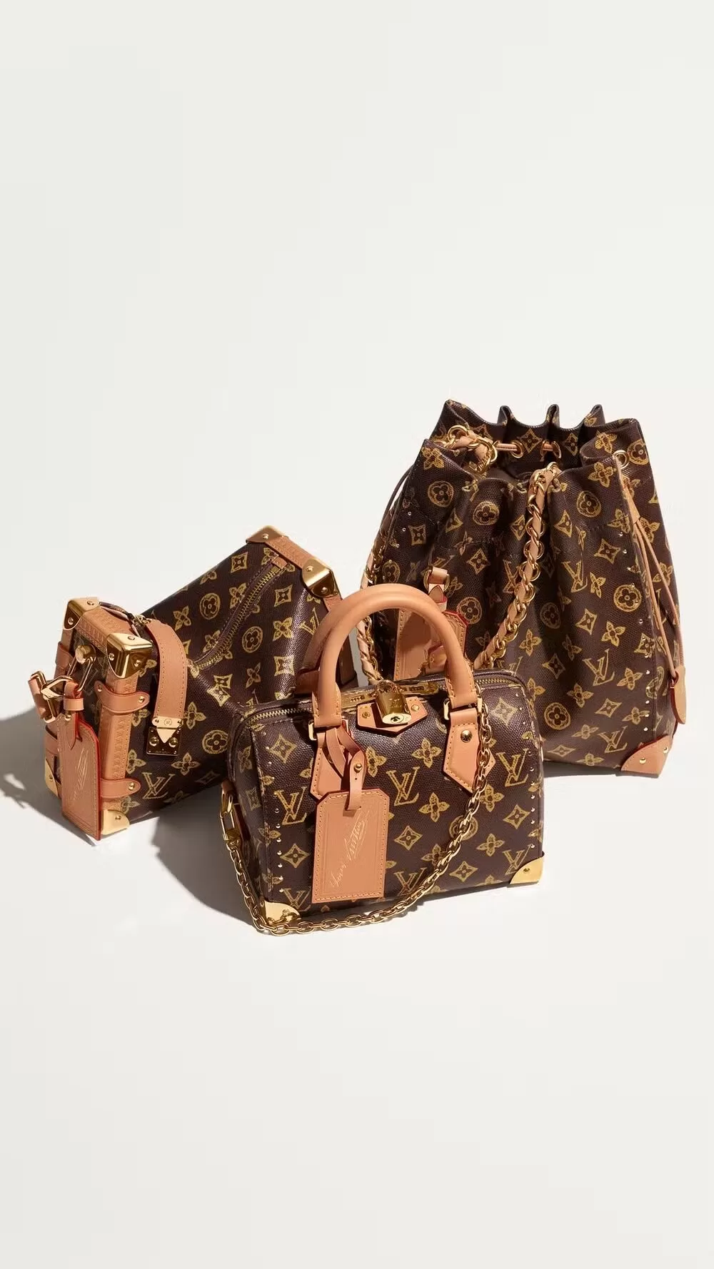 A cápsula Monogram Origine revisita o desenho original em um novo canvas de linho e algodão, inspirado em registros históricos de 1908. A base Ebène ganha tons pastel delicados, Lin, Vert Asnières, Rose Ruban e Bleu Courrier e acabamento acetinado, equilibrando herança e contemporaneidade. Ícones como Speedy, Noé, Alma, Neverfull e versões Trunk integram a linha, todas acompanhadas por uma tag exclusiva com a assinatura manuscrita de Louis Vuitton, reforçando a conexão entre memória e design atemporal.