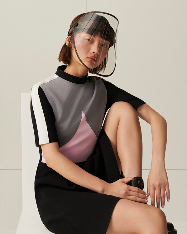 O modelo da LV é um escudo facial com tiras de elástico com o monograma da marca que se ajusta ao redor da cabeça da pessoa. O escudo também é sensível a luz, em lugares com maior claridade, escurece.