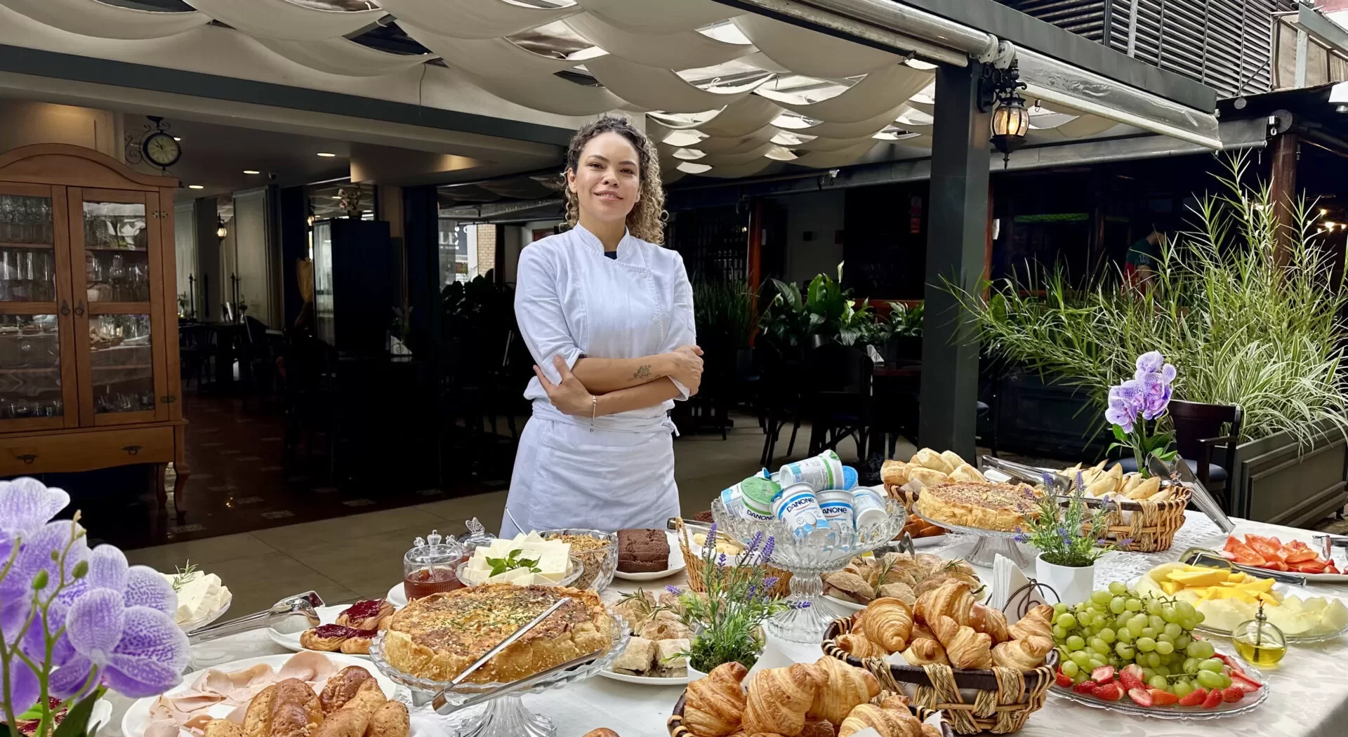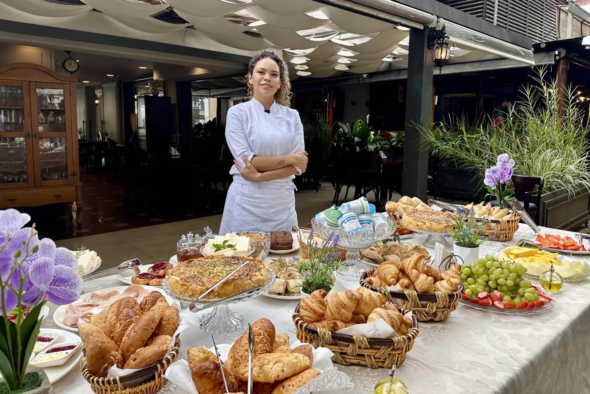 A mesa reúne uma seleção generosa de pães artesanais, croissants, ovos mexidos, quiches, pão de queijo, pão de calabresa, misto quente, sanduíche de rosbife no pão ciabatta e toast de gorgonzola. Queijos e frios, bolos frescos, frutas selecionadas, chá gelado, café Illy e sucos naturais completam o serviço à vontade.