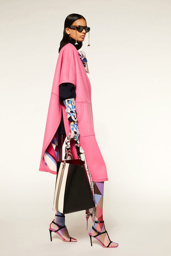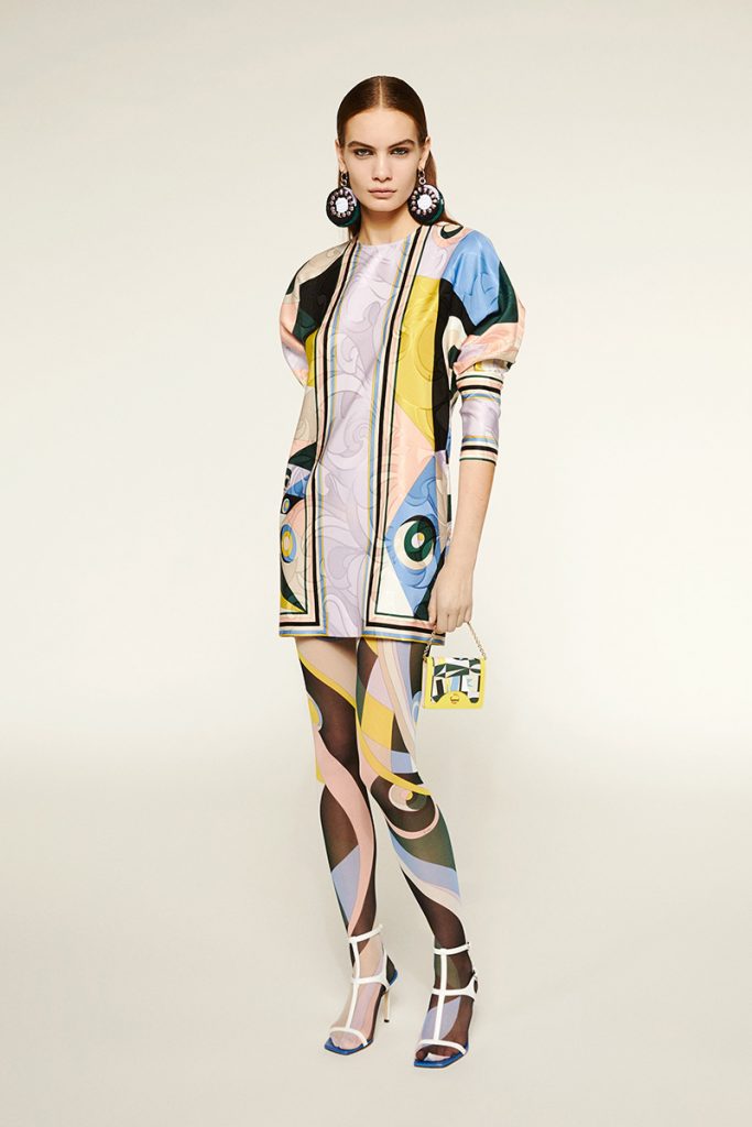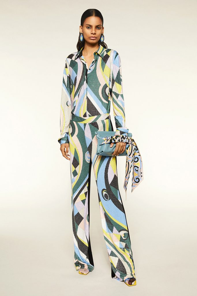 A estamparia carro-chefe da casa italiana ganha uma infinidade de motivos ondulantes, onde a clássica assinatura de Pucci parece se dissolver em micropartículas, evocando uma atmosfera dinâmica e moderna, feminina e inovadora.