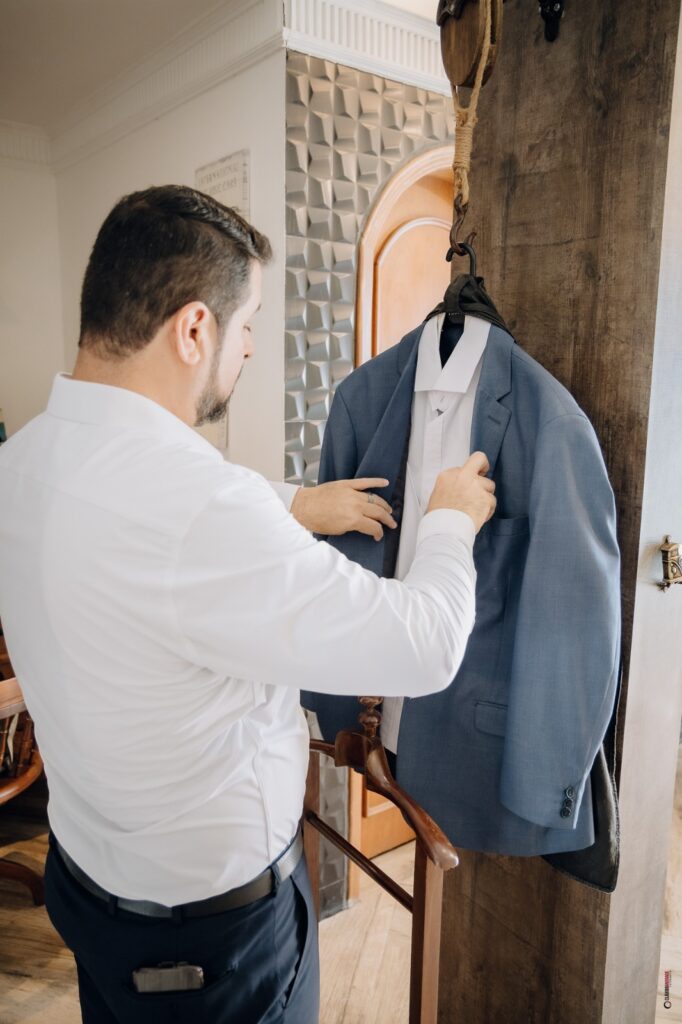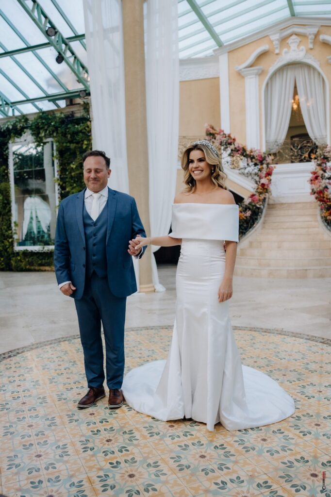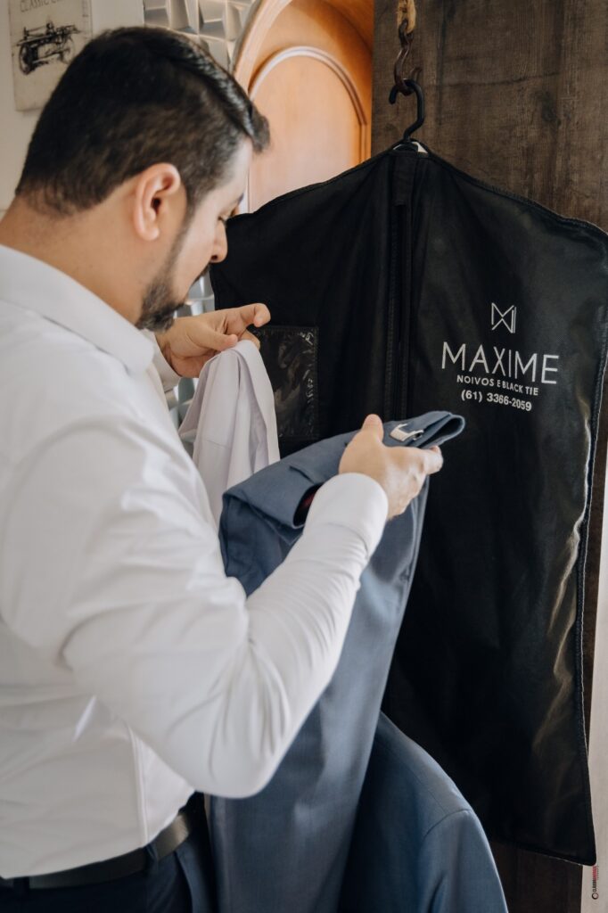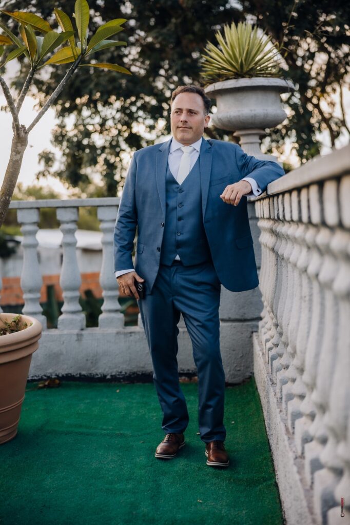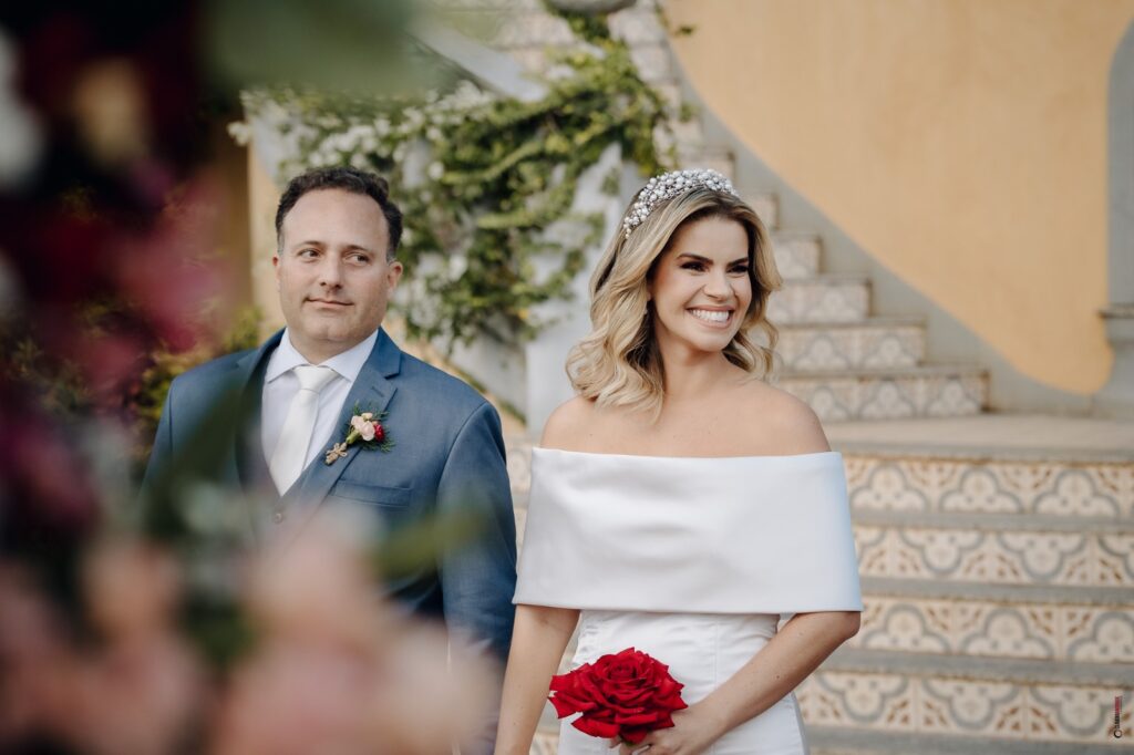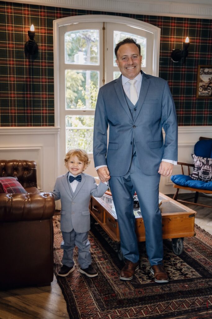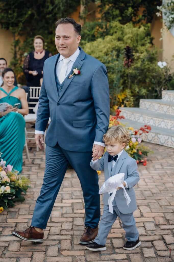 Rodrigo Freire vestiu um tradicional terno azul índigo da Maxime Noivos e Black Tie. A peça foi feita sob medida com forro trabalhado, pesponto na lapela e corte italiano. O pequeno Mateus, filho do casal, participou da cerimônia como pajem, e usou um terno semelhante ao do pai, assinado pela Margarida e Germano Alta Costura Infantil.