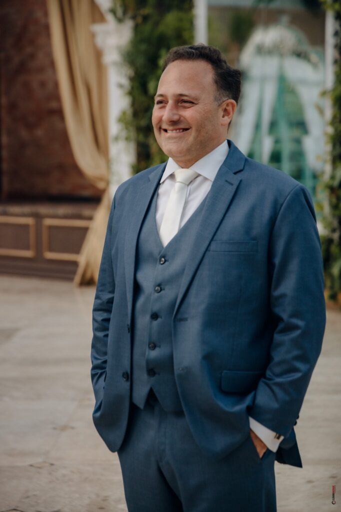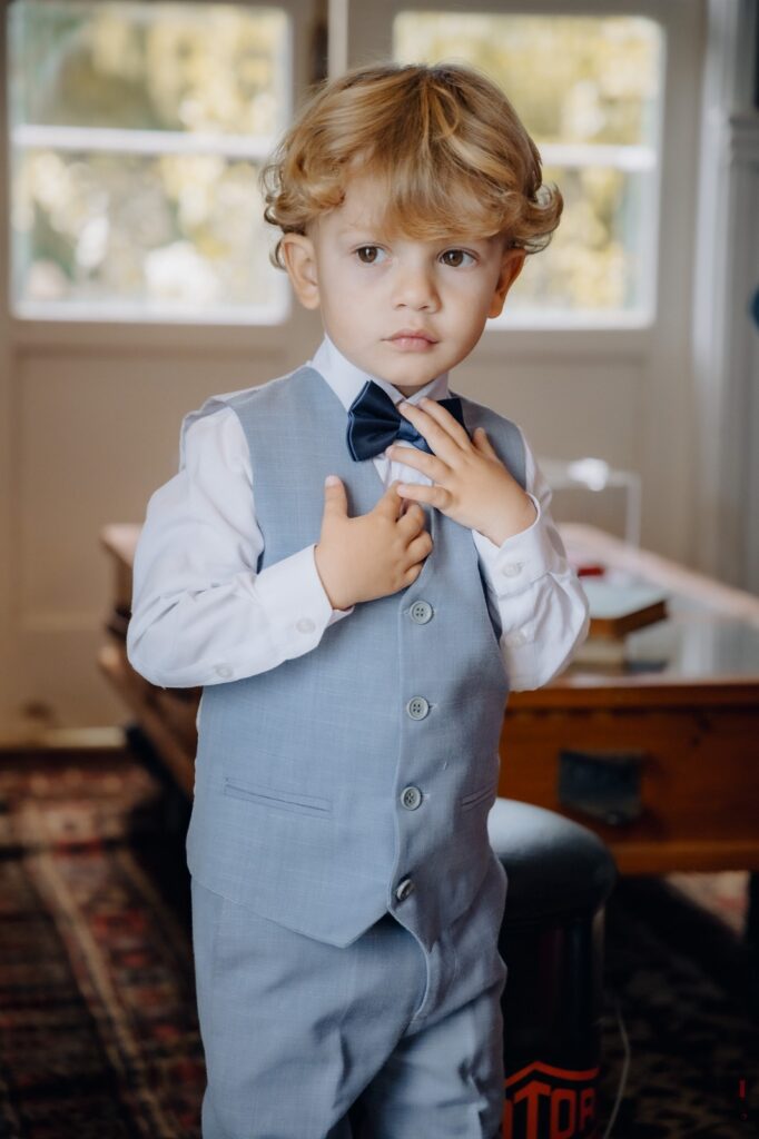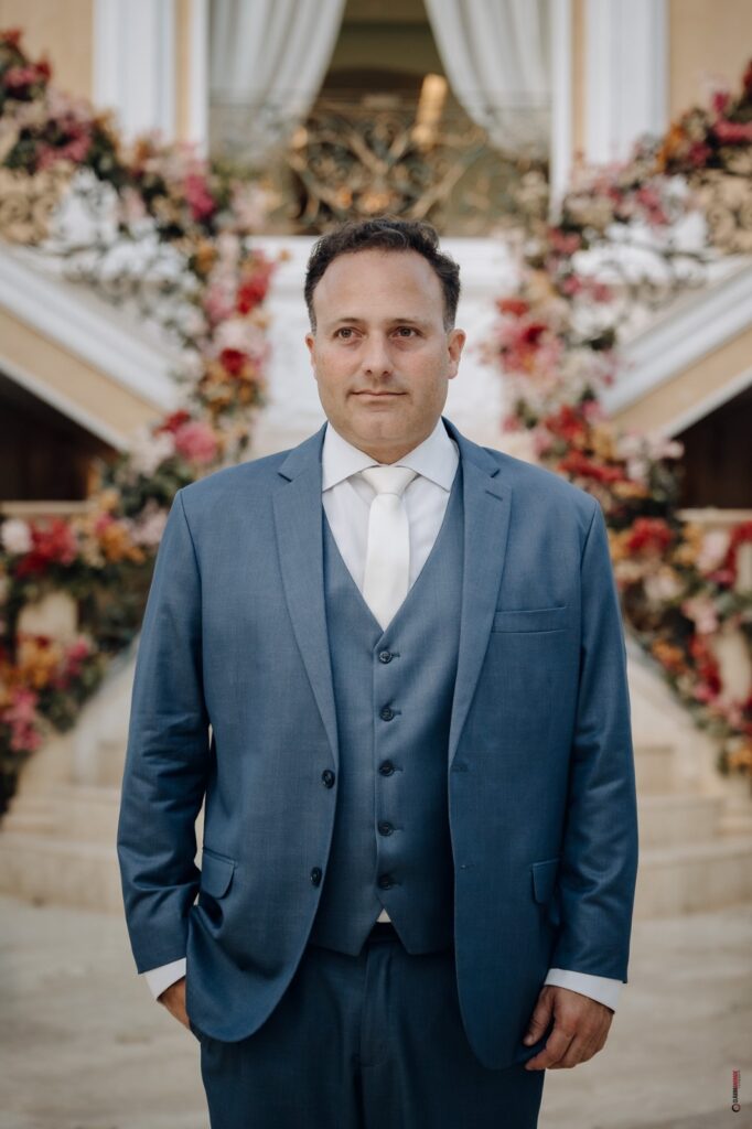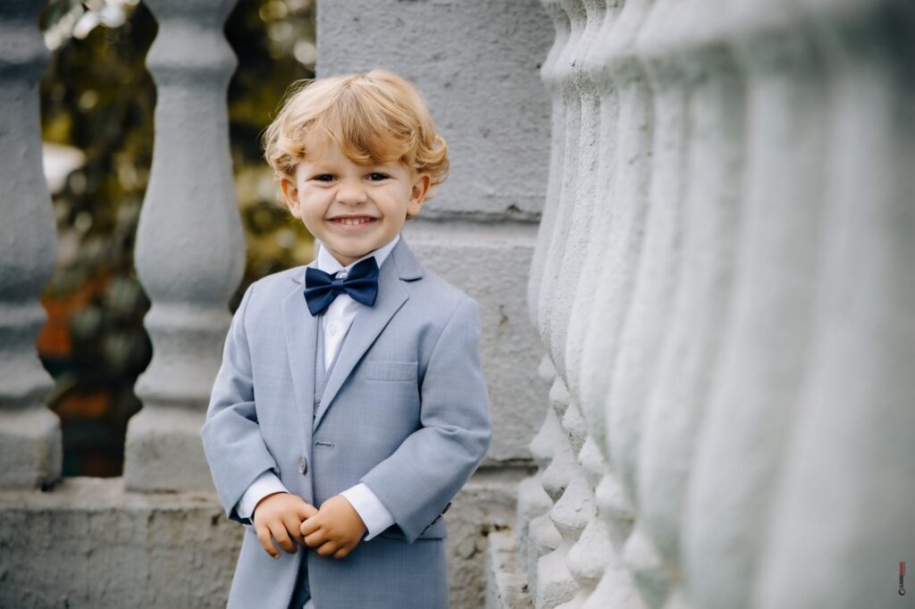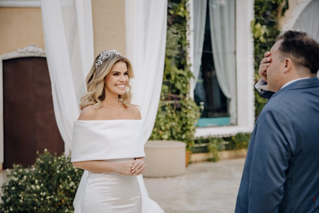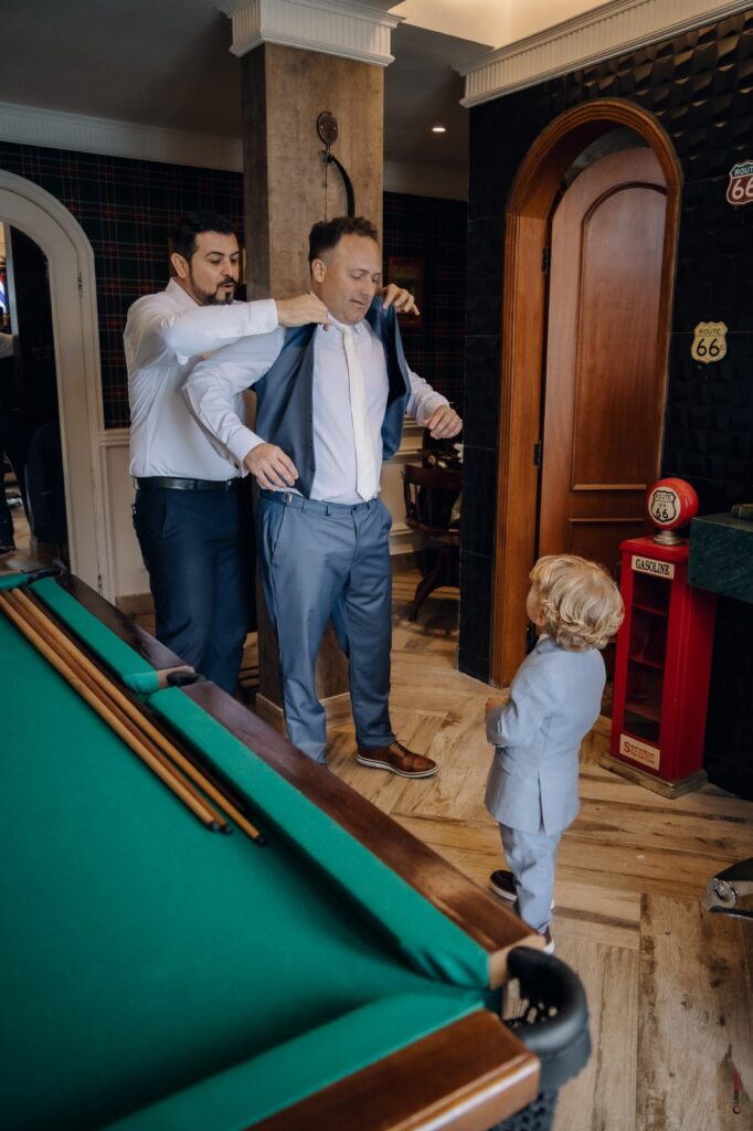 Rodrigo Freire vestiu um tradicional terno azul índigo da Maxime Noivos e Black Tie. A peça foi feita sob medida com forro trabalhado, pesponto na lapela e corte italiano. O pequeno Mateus, filho do casal, participou da cerimônia como pajem, e usou um terno semelhante ao do pai, assinado pela Margarida e Germano Alta Costura Infantil.