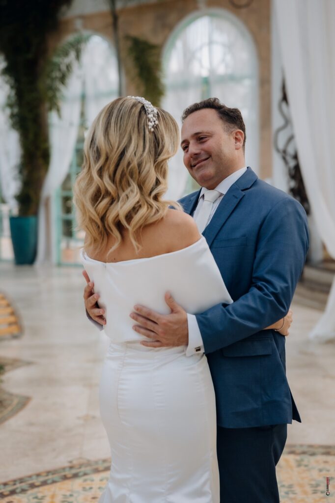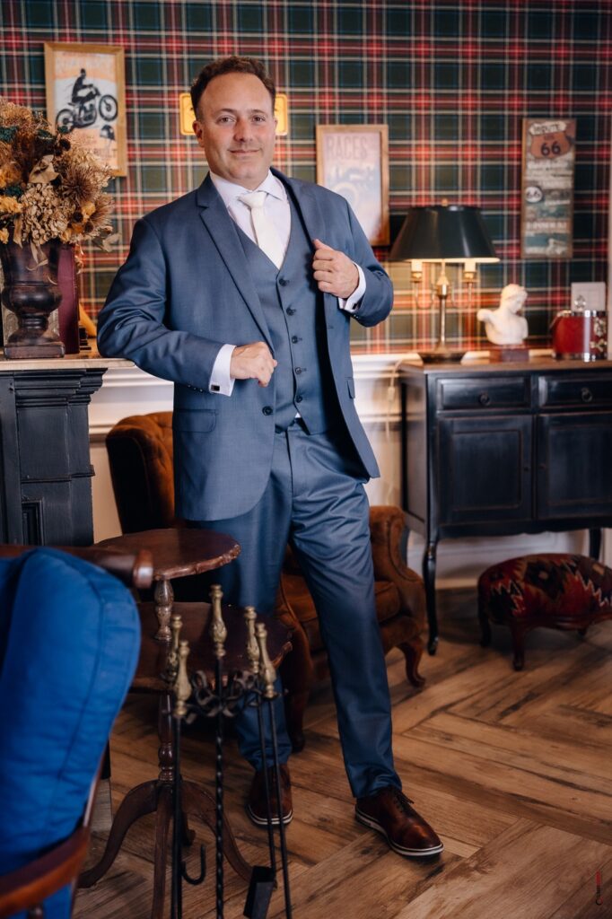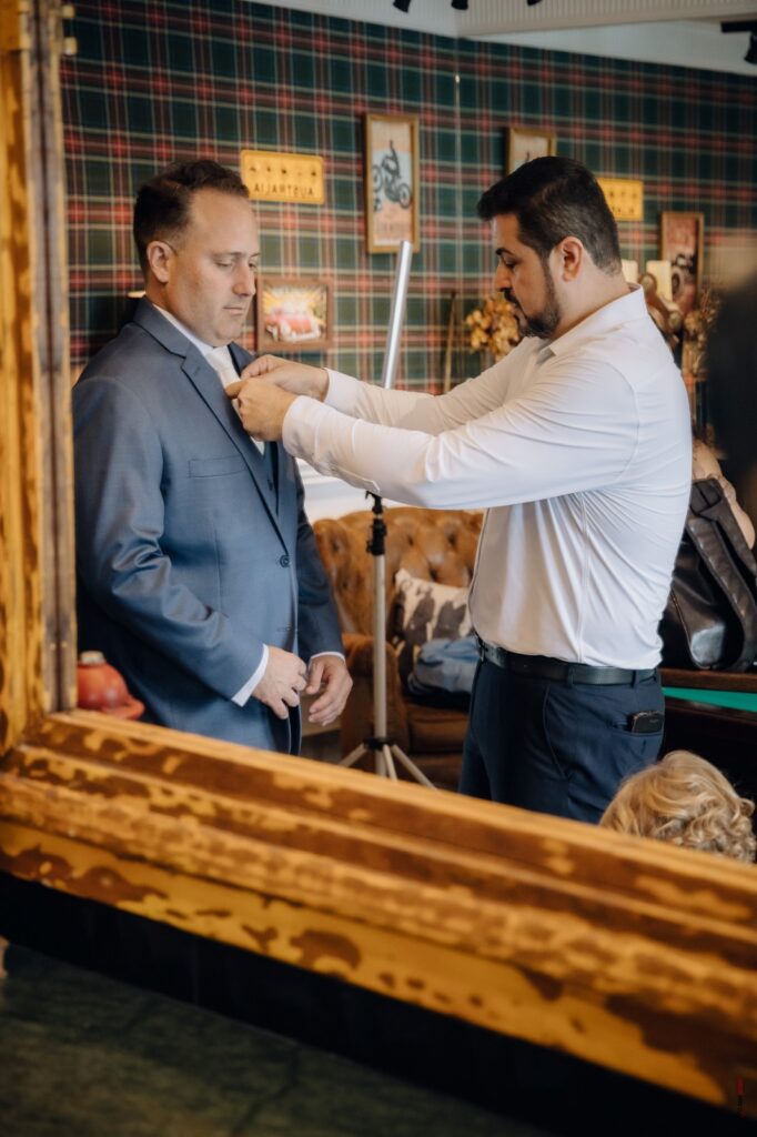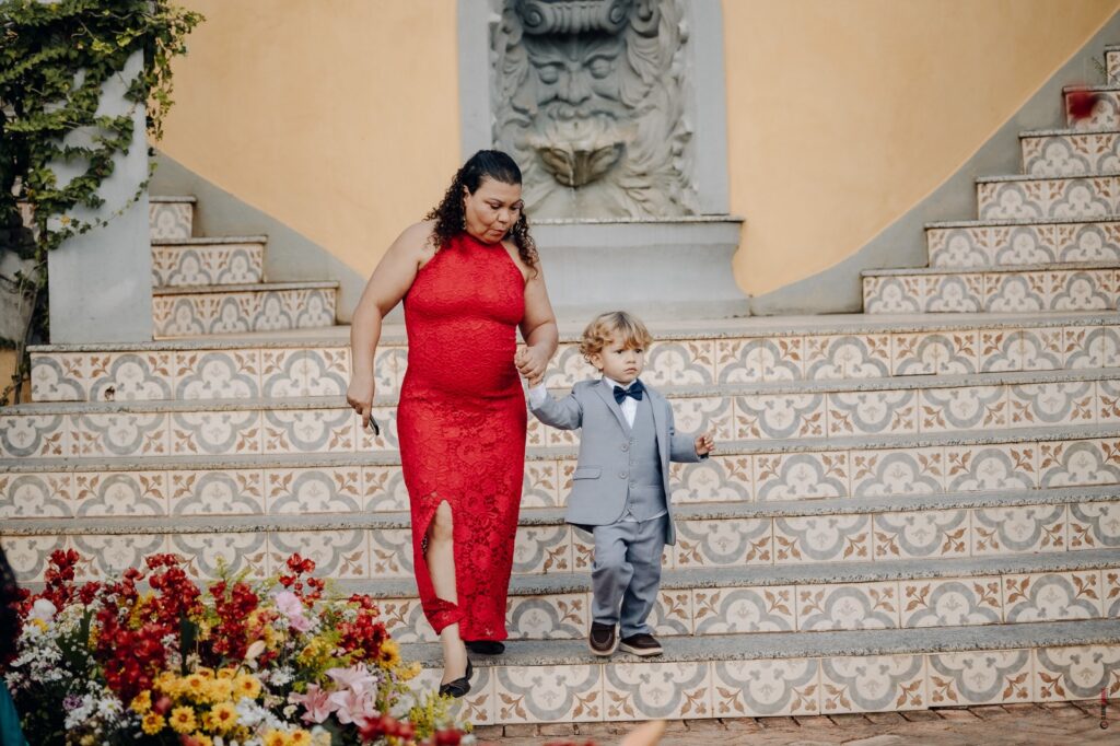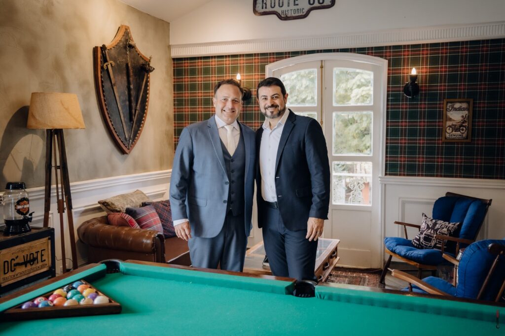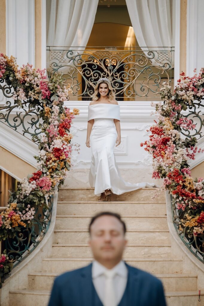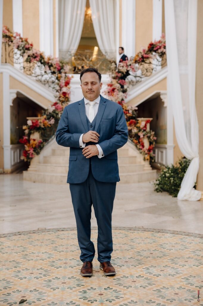 Rodrigo Freire vestiu um tradicional terno azul índigo da Maxime Noivos e Black Tie. A peça foi feita sob medida com forro trabalhado, pesponto na lapela e corte italiano. O pequeno Mateus, filho do casal, participou da cerimônia como pajem, e usou um terno semelhante ao do pai, assinado pela Margarida e Germano Alta Costura Infantil.