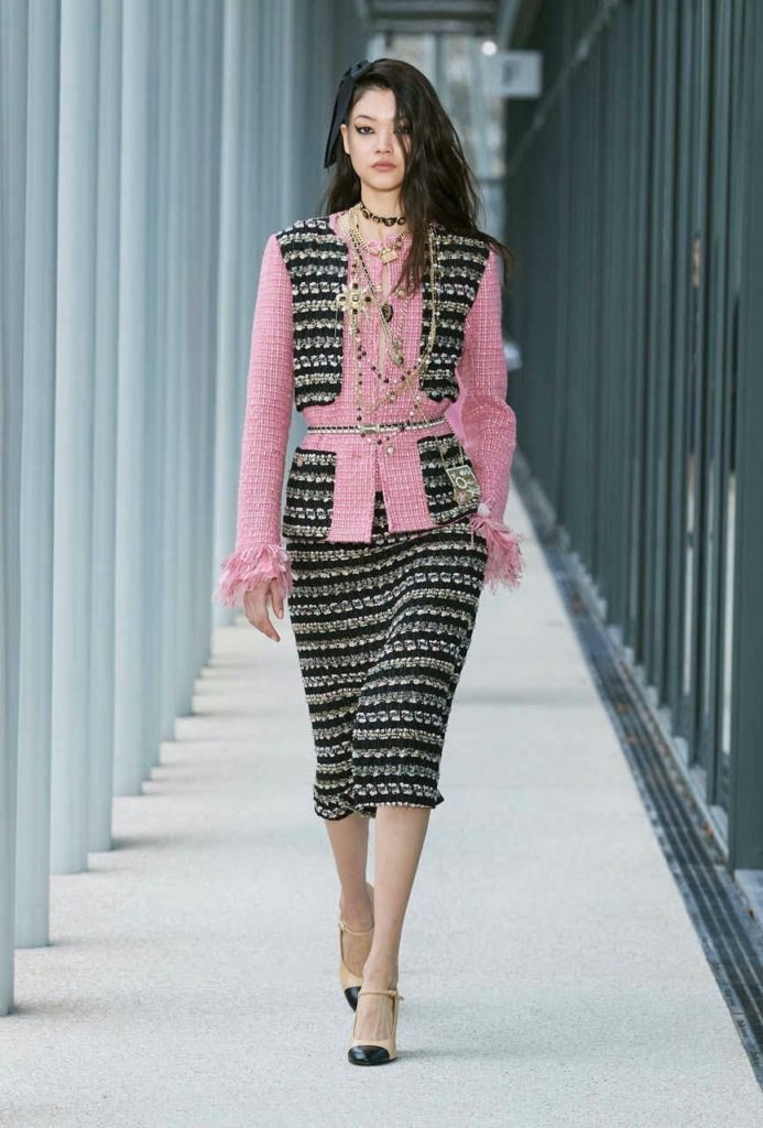Para a temporada 21/22, esse cuidado surge por toda a coleção, da chapelaria da Maison Michel aos Mary-Janes com saltos adornados com pérolas confeccionados por Massaro. A junção entre o concreto modernista e urbano e a delicadeza das tramas conduz a coleção.