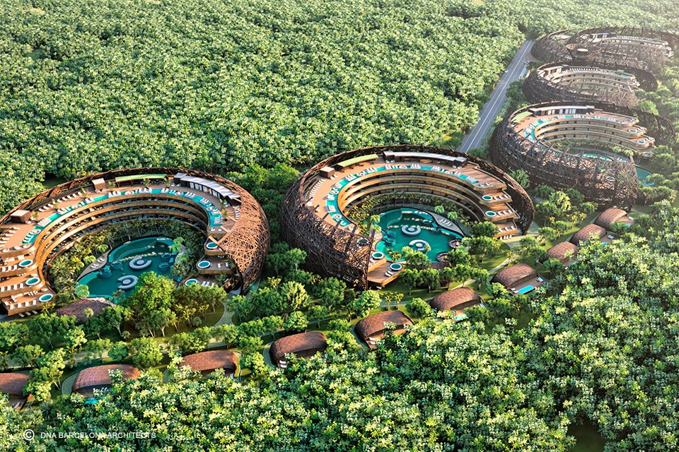 O estúdio de arquitetura e design espanhol DNA Barcelona Architects apresenta os primeiros detalhes do Cocoon Hotel & Resort em Tulum, no México: um complexo de edifícios inspirados no mar e na selva.