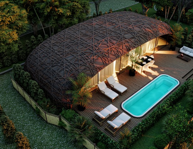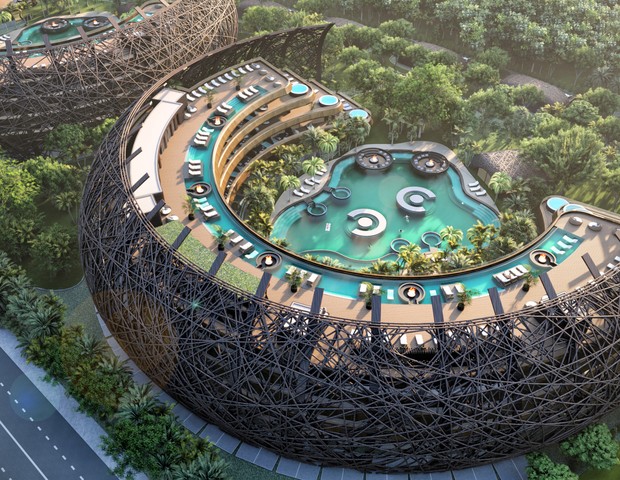 O design do Cocoon é baseado na conexão entre o ambiente natural e a geometria A organização dos casulos permite a máxima visão da paisagem. Cada casulo oferece piscinas naturais, ginásio, clube infantil, sala de conferências, bar e restaurante, e jardins, tudo integrado para conseguir uma arquitetura biomimética.