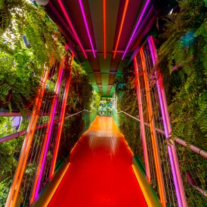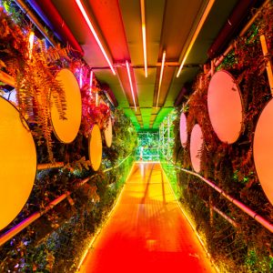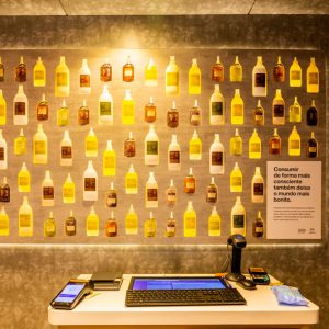 Seguindo em frente, um painel explicativo mostra ao público medidas práticas para se engajar na causa da Amazônia. O texto está dividido em “valorize”, “conscientize” e “manifeste”. E, por fim, a última ativação musical, “vibre”, representa o ritmo da guitarrada. Tubos de led com cordas dentro são ativadas conforme o público as tocam, produzindo o timbre característico desse ritmo. Um texto também informa mais sobre a cultura da guitarrada.