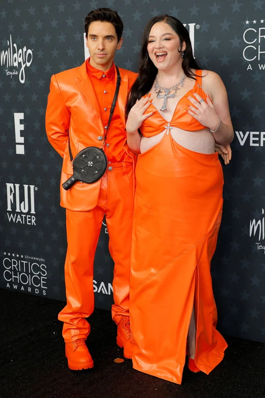 Os colegas de elenco de Hacks, Paul W. Downs e Megan Stalter, fizeram uma referência bem-humorada aos looks totalmente laranja usados por Timothée Chalamet e Kylie Jenner na estreia de Marty Supreme no mês passado, assinados por Erica Costumes. Mike Blake/Reuters.
