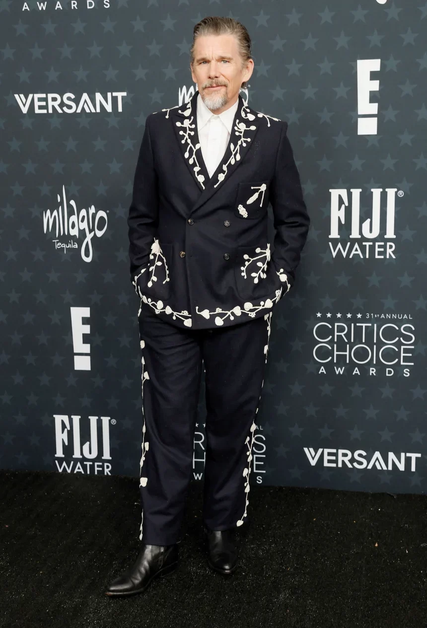 Ethan Hawke chegou usando um terno de abotoamento duplo com bordados da marca Bode, adicionando um toque artesanal e sofisticado ao visual clássico. Caroline Brehman/Reuters.