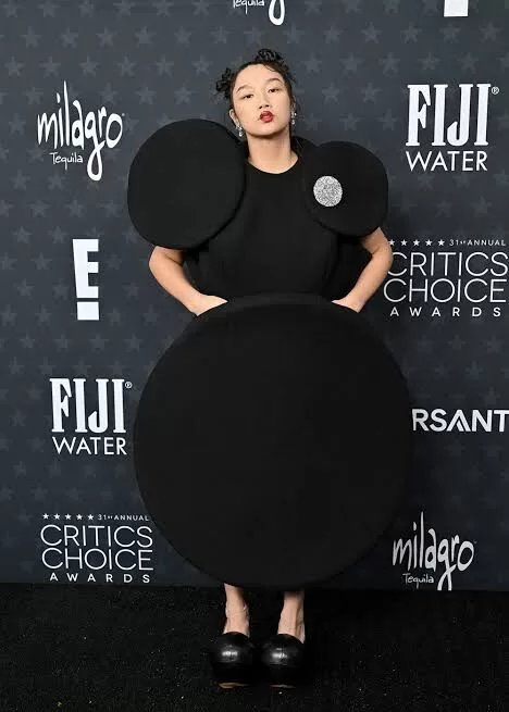 Audrey Nuna, voz da personagem Mira em KPop Demon Hunters, trouxe leveza e personalidade ao vestido preto ao apostar em uma criação da Marc Jacobs com atitude divertida e contemporânea. Adam Jason Finmann/Getty Images.