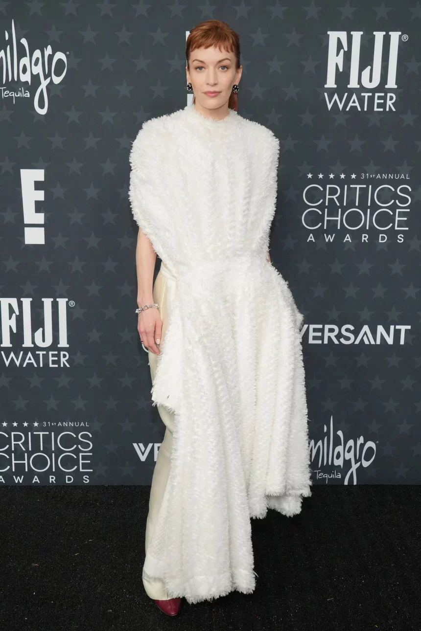 Britt Lower surgiu com um top de ombros texturizados, quase etéreos, da Bottega Veneta, combinado com calça de sarja creme, criando um contraste elegante entre volume e simplicidade. Jordan Strauss/Invision/AP.