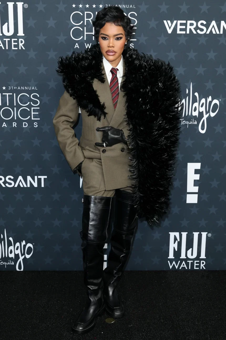 Com luvas de couro, botas over the knee e gravata listrada, Teyana Taylor adaptou um terno de plumas da coleção masculina outono-inverno 2025 da Saint Laurent, em um visual de forte impacto e personalidade. JC Olivera/WWD/Getty Images.