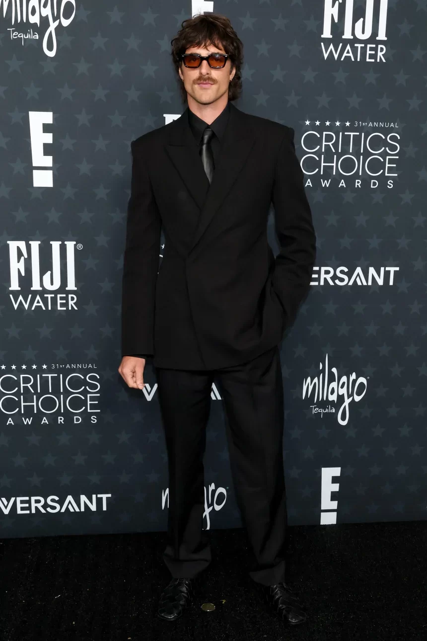 Jacob Elordi chegou com uma proposta minimalista e afiada, vestindo um look totalmente preto da Bottega Veneta, complementado por óculos escuros que deram ainda mais força ao visual clean e contemporâneo. Getty images.