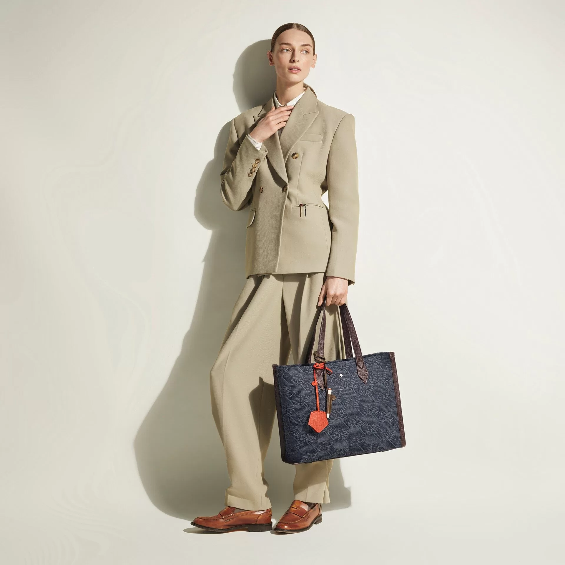 A coleção ainda apresenta novas interpretações do padrão 4810 da Montblanc, agora em denim azul estampado com alças em couro ébano, aplicado em modelos como a Tote e a Mini Crossbody. Para completar, a Maison lança acessórios funcionais como necessaire, pouch com zíper, porta-passaporte e mini carteira, além da mala #MY4810 em navy blue com detalhes em ébano, pensada para acompanhar a temporada com elegância nas viagens.