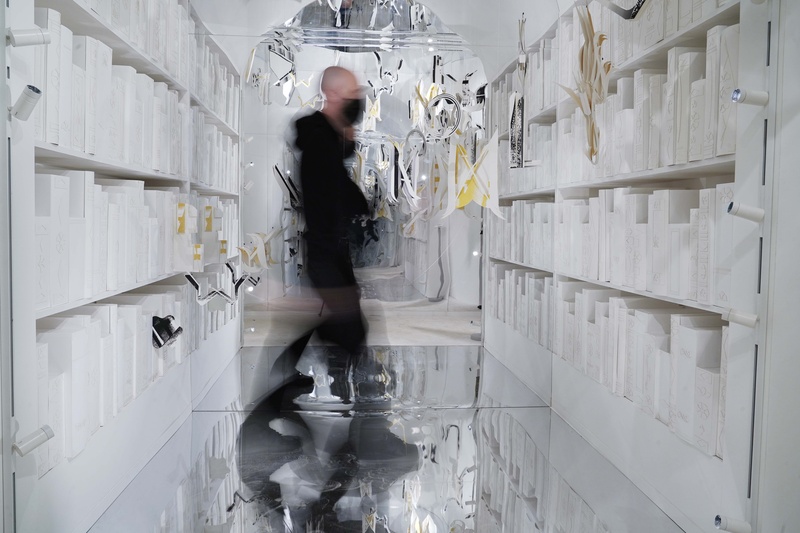 O espaço é uma representação metafórica desse savoir-faire: as estantes de livros representam esse conhecimento e saber-fazer acumulados, escritos e transmitidos ao longo do tempo como um tesouro precioso. O arco é um símbolo dessas antigas bibliotecas e das pontes de Veneza como elos entre culturas e saberes. O espelho reflete infinitamente a biblioteca e as letras evocando a perpetuação e evolução do conhecimento ao longo do tempo. O alfabeto imaginário, representado pelas letras de papel que flutuam no espaço como se escapassem dos livros, é uma ilustração gráfica e física do pensamento e da criação, formalizada pela escrita. Graças ao trabalho de Lorenz Boegli, um impressor incomparável, e suas habilidades únicas de serigrafia, é criada uma experiência ousada e imersiva. Através do seu tratamento e da aplicação de tintas fosforescentes, o alfabeto revela-se ao visitante de duas formas distintas, dando liberdade à sua imaginação para absorver a obra.