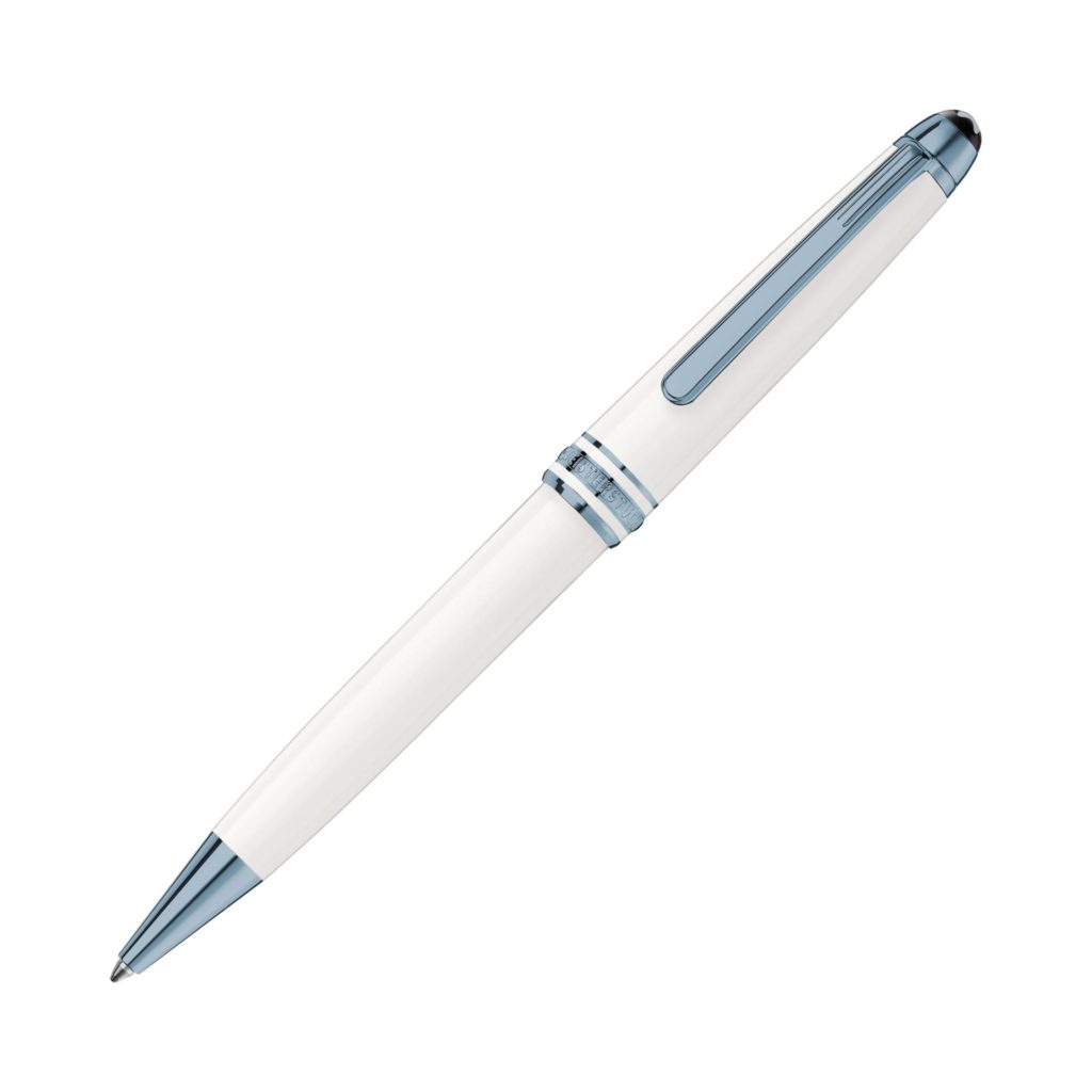 Feita em resina preciosa, a esferográfica Meisterstück Glacier Classique, na cor branca, é inspirada nos glaciares da montanha Mont Blanc, que representa o espírito aventureiro da exploração. O instrumento de escrita é realçado com detalhes em metal revestido com PVD de cor azul.