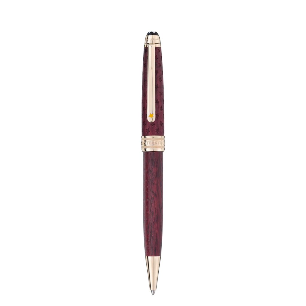 Romântica e inspiradora, a esferográfica Meisterstück Pequeno Príncipe Solitaire, com tampa em madeira na cor bordô, está vinculada à estética do icônico emblema Montblanc. Os três anéis, revestidos a platina, apresentam o nome da marca e o clipe é adornado com uma estrela laqueada amarela.