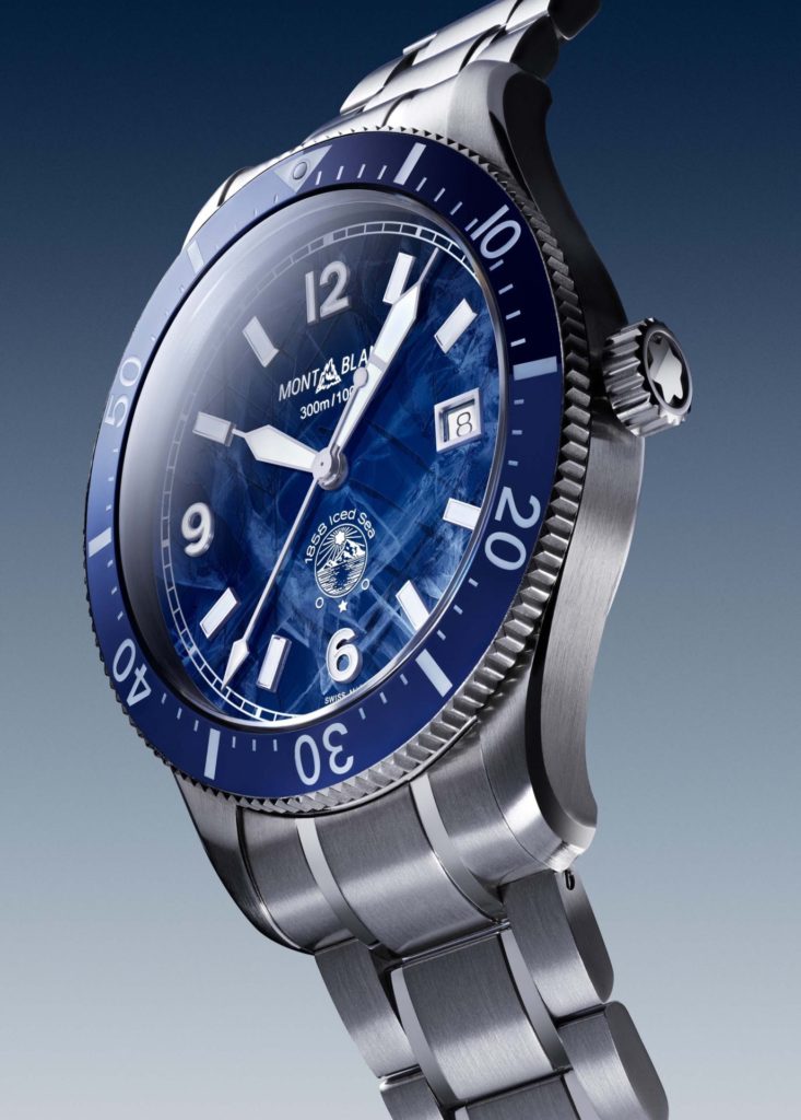 O relógio 1858 Iced Sea Automatic Date, o primeiro com mecanismo de mergulho esportivo da Montblanc, possui o mostrador com padrão glacial inspirado no Mar de Gelo, principal geleira do Maciço do Mont Blanc. Com bisel unidirecional em cerâmica bicolor, fundo da caixa gravado e uma pulseira cônica intercambiável em aço inoxidável, é resistente até 300 metros de profundidade, garantindo mergulhos inesquecíveis ao seu portador.