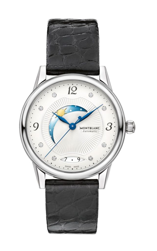 O relógio Bohème Day & Night 34 mm, com diamantes e pulseira de crocodilo, possui um atraente encanto feminino, que vai fazer os olhos da sua amada brilharem ainda mais. O dia é indicado por um sofisticado azul claro com um sol dourado, enquanto que a indicação da noite é representada por um azul escuro intenso, decorado com uma lua dourada adornada pelas estrelas. Possui também um mostrador guilhochê com algarismos arábicos florais.