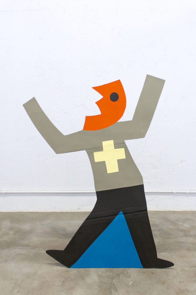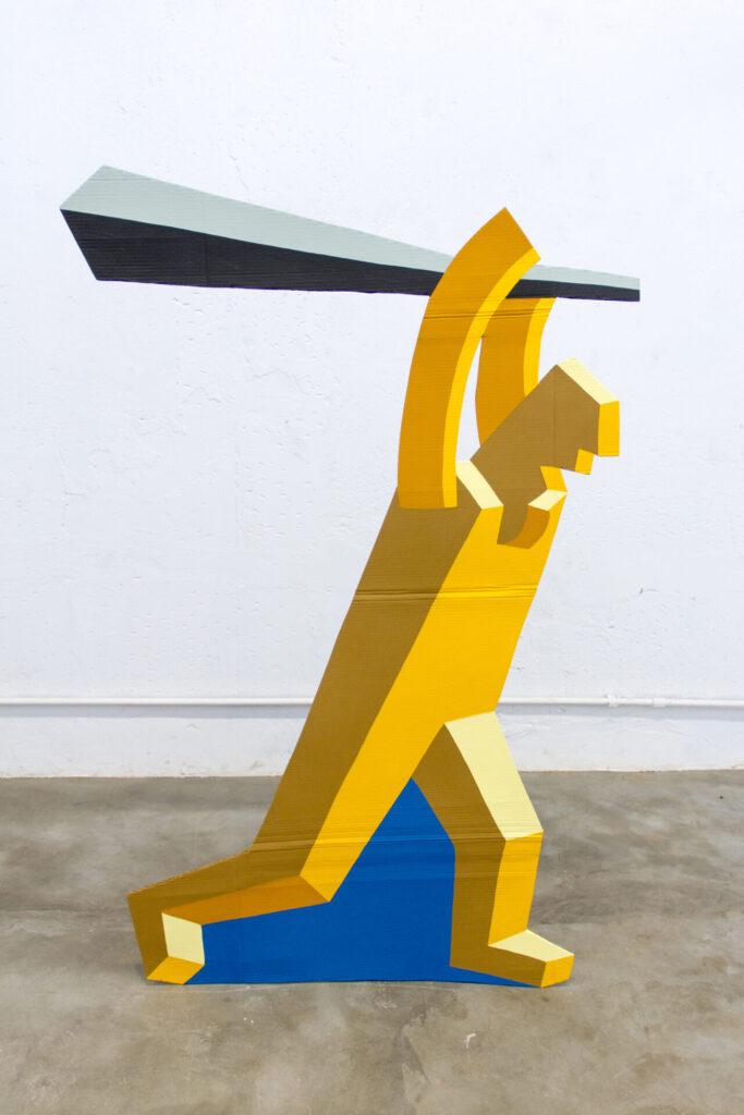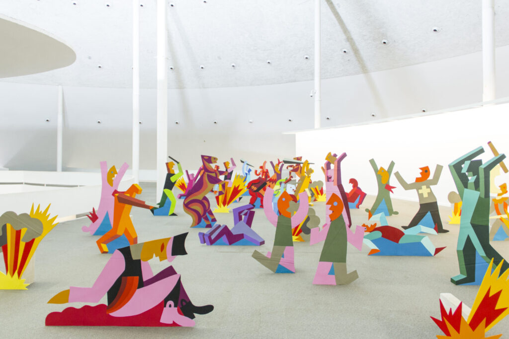 “A instalação, que tem frontalidade evidente, utiliza o mezanino do Museu Nacional como um palco teatral desprovido de sua caixa cênica, expondo a fragilidade que sustenta o conflito retratado na parte frontal. Ao observar a obra por trás, revela-se uma paisagem de silhuetas de papelão, com as bordas borradas pela tinta e sustentadas por blocos de concreto. Essa cenografia se desnuda, revelando suas próprias entranhas e ressaltando a vulnerabilidade inerente à materialidade e à narrativa que compõe”, ressalta o artista.