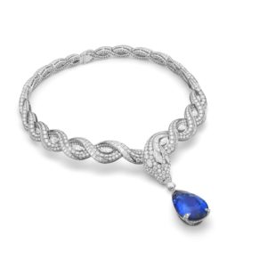 Uma excepcional safira em forma de gota de 61,30 quilates do Sri-Lanka pende da boca da cobra como o ponto focal deslumbrante e incrivelmente brilhante da peça, cativando o espectador com seu coração azul vibrante e vívido.