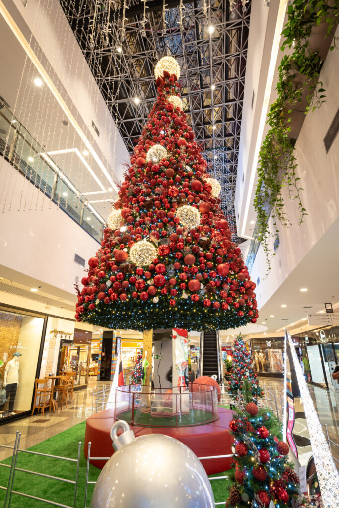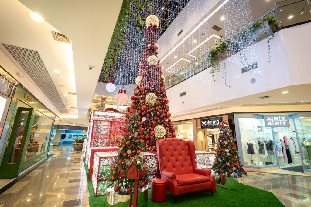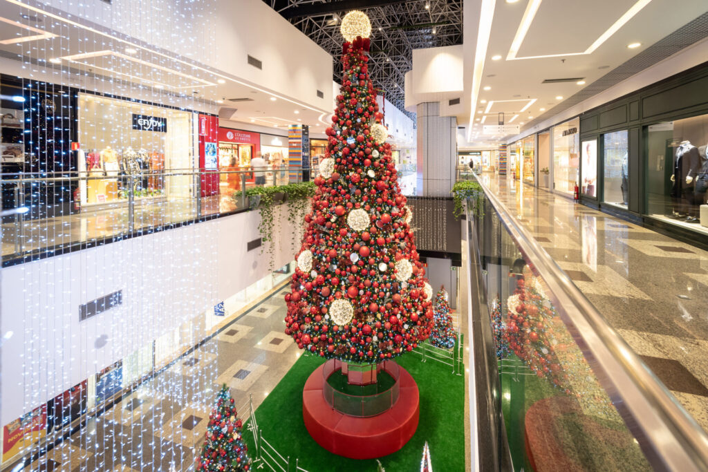 No interior do shopping, as luzes irão brilhar intensamente durante a temporada. Já na decoração, os tons de vermelho são destaque, dos adornos decorativos à árvore de Natal, que surge imponente na Praça Central. Já a fachada, recebe iluminação de led em tons de prata que compõem com graça a decoração externa.