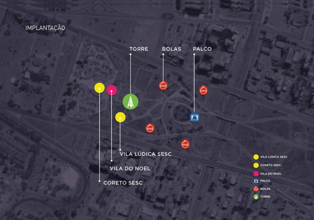 A projeção poderá ser vista a uma distância de 5 quilômetros. A Vila do Noel e um coreto para a apresentação de corais – com calendário específico de apresentações – complementarão o cenário.