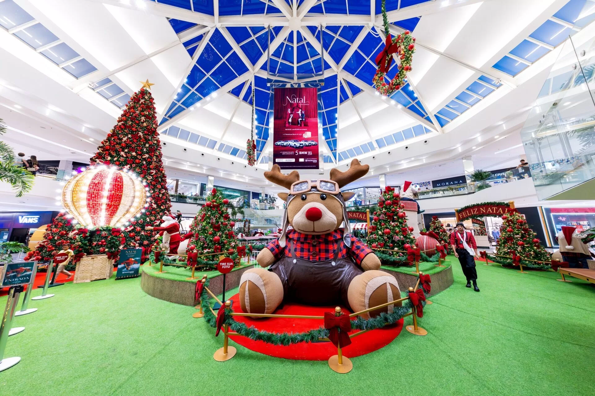 A jornada pelo Natal nas Alturas no ParkShopping se revela em cenários que encantam pelo olhar e pela delicadeza dos detalhes. Na Praça Central, uma árvore de 12 metros, iluminada por milhares de lâmpadas de LED, traduz o espírito natalino em tons de vermelho e dourado. Bolas, laços, mini presentes, botinhas, sinos e meias compõem a ornamentação, enquanto uma passagem interna permite que os visitantes se aproximem ainda mais desse universo simbólico. Ursos gigantes, renas e um banco com Papai e Mamãe Noel completam o cenário, criando espaços pensados para registros afetivos e memórias de família.