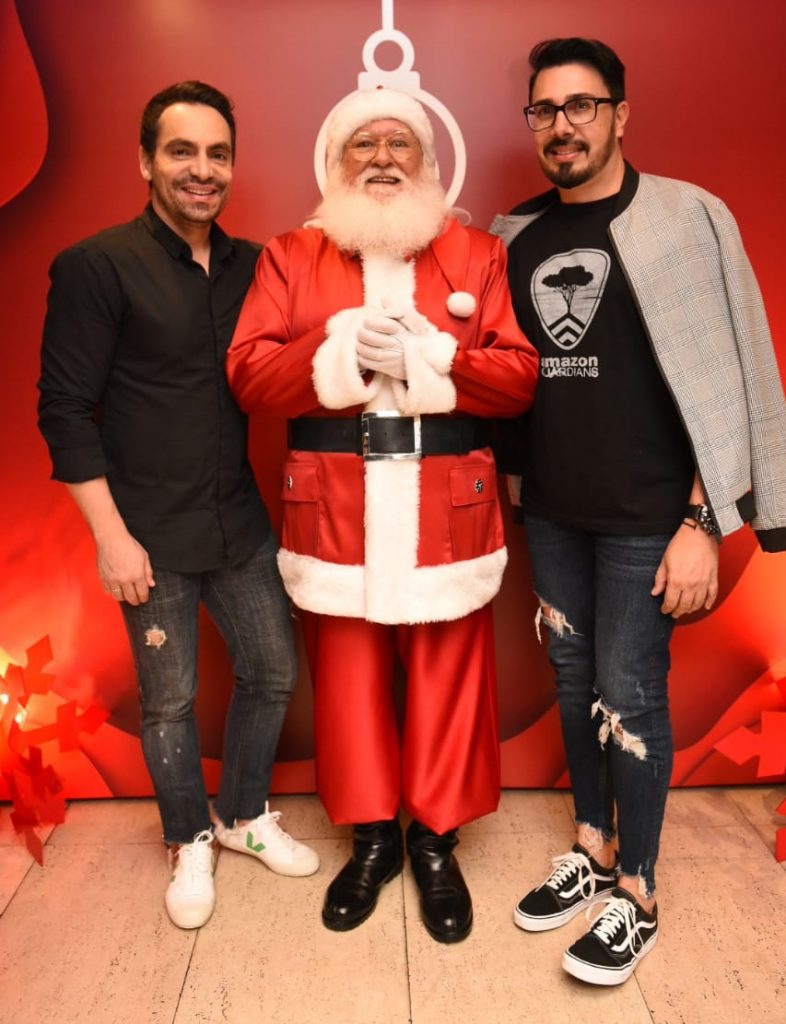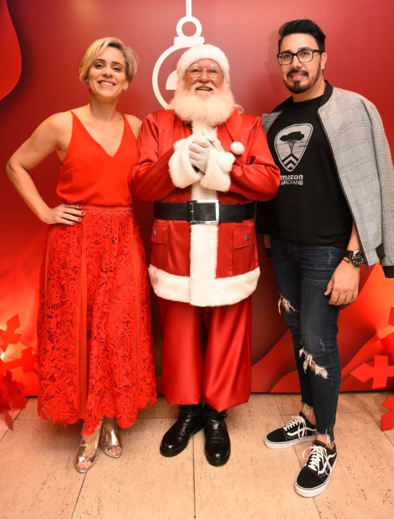 Valter Lourenço, o Papai Noel e Hendy Miranda na apresentação do “Natal Rubi” no Coco Bambu