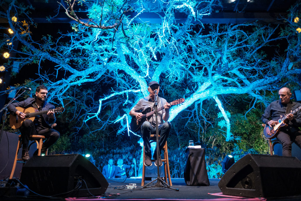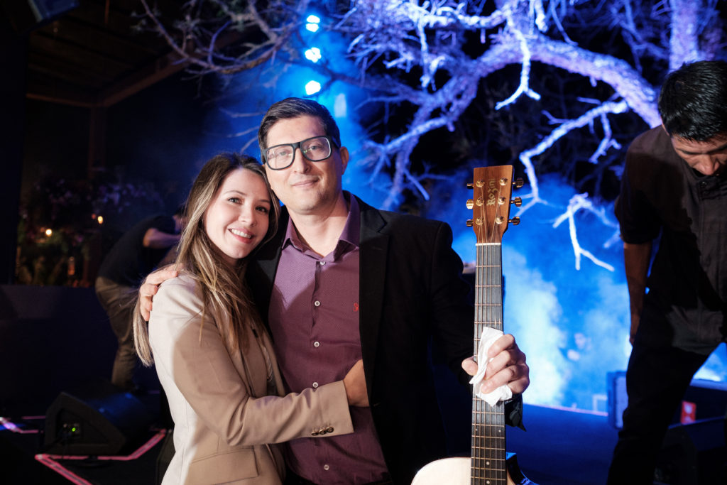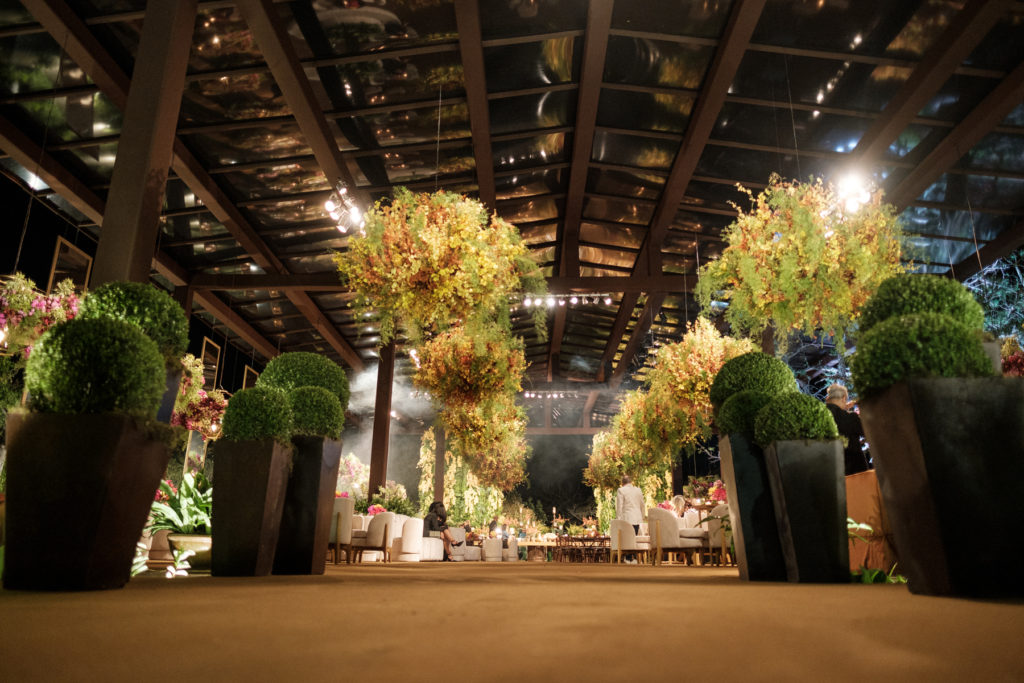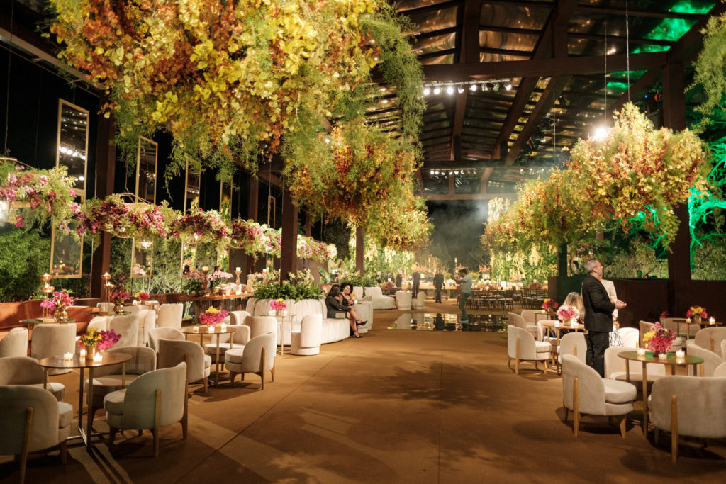 A decoração espetaculosa na área externa foi assinada por Valéria Leão com lindos arranjos florais suspensos harmonizados com os de mesa e velas, além da iluminação. O mobiliário foi todo pensado para o conforto dos convidados.