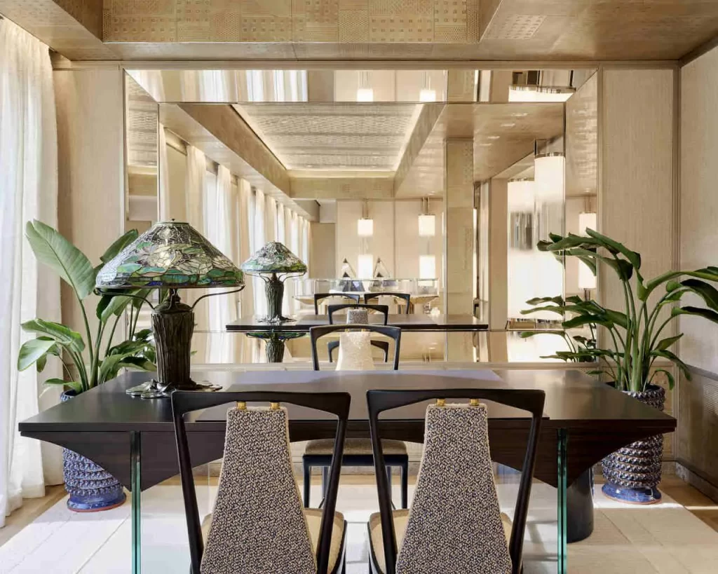 A galeria apresenta ainda um abajur de mesa com lírio d’água da Tiffany Studios, fundada por Louis Comfort Tiffany, em 1902, assim como o tecido metálico de parede feito à mão, cadeiras vintage e uma escrivaninha sob medida suspensa em pernas de vidro.