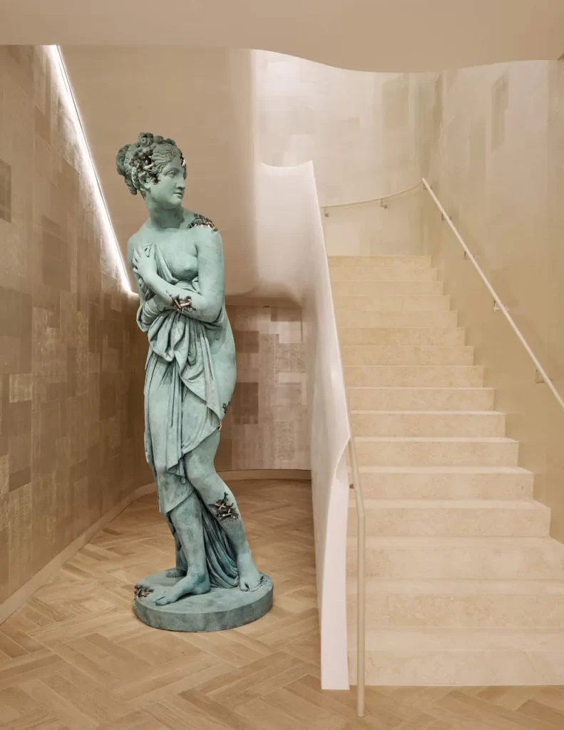 O centro da loja conta com uma escadaria inspirada na escadaria do The Landmark, com paredes douradas e pratas. À esquerda da escadaria, uma escultura de Daniel Arsham, Bronze Venus Italica (XL), também espelha a que está em exibição aos pés da grande escadaria do The Landmark.