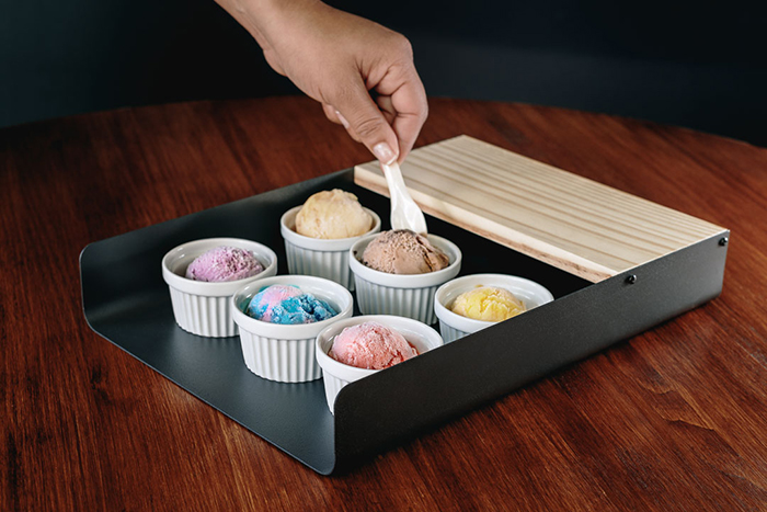 Sempre frescos e cremosos, os gelados são preparados minuciosamente e toda a produção pode ser vista pelos comensais. “Sou apaixonado pela complexidade da fabricação dos sorvetes e minha ideia é oferecer uma variedade de sabores autorais de forma sazonal. Mas, claro, sempre respeitando as preferências dos clientes. Um exemplo é o sabor doce de leite com banana caramelizada, que fiz como teste e não saiu mais da minha bancada”. explica o chef.